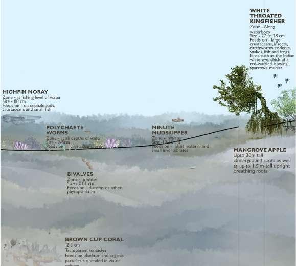 In 1879, the island of Trombay was surrounded by thick growth of coconut and palm trees with fewer salt pans and paddy fields whereas the opposite edge was marked by numerous salt pans, paddy fields, Sewri fort and a chain of docks. Over the years, these edges transformed into embankments and industrial land causing loss of salt pans and hence the variety of flora and fauna which earlier thrived in the region. Moreover in 2020, reclamation activities caused the sea to narrow and form what we refer to as Mahul creek in the present day. The intent was to be able to emphasize the ground-water relationship in conjunction with the biodiversity which flourishes in peculiar habitat conditions.