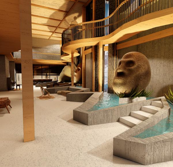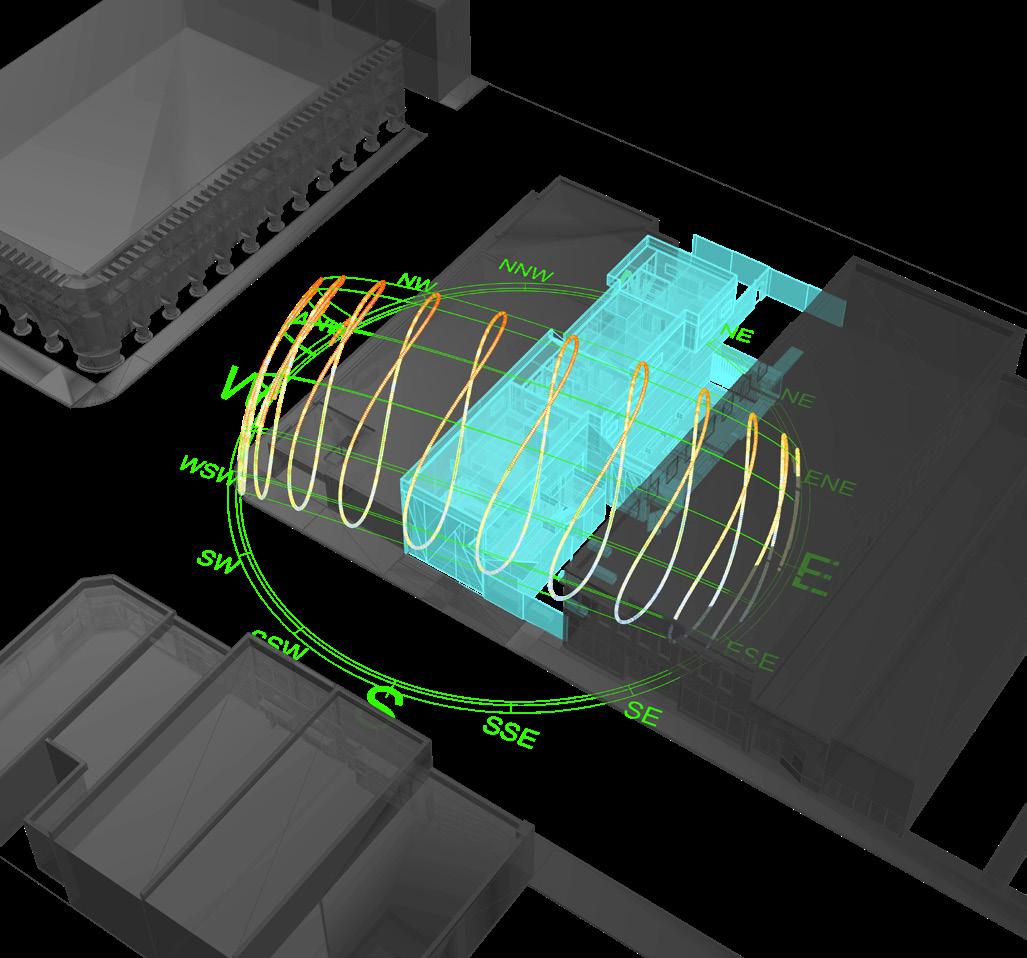 The material of the wall, clad in travertine stone, brings back the audience from the overall international modern theme to the historical roman signi cance. It guides us through and directs us to the main hall inside.