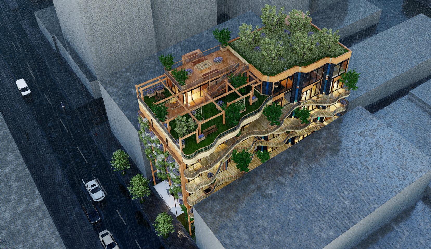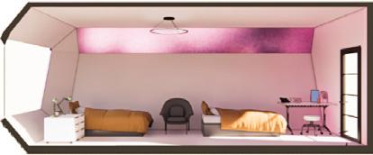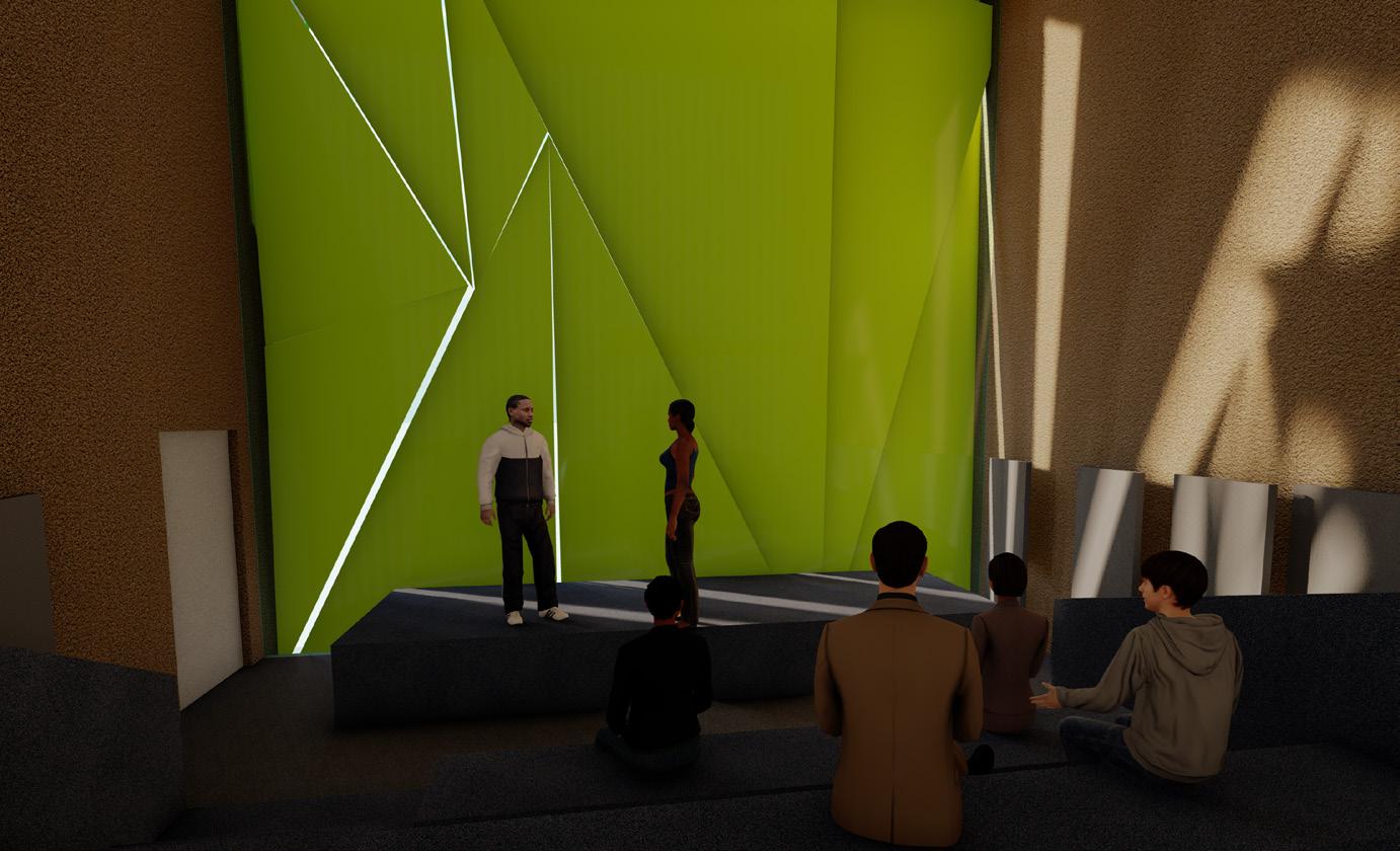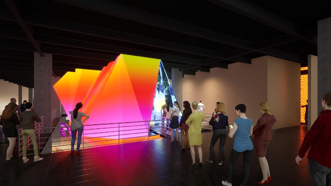 The exterior of the hanging immersive experience piece educates the people and communicates with the occupants about the building. For instance, blue indicates excessive use of water, urging occupants to reduce the water use.
