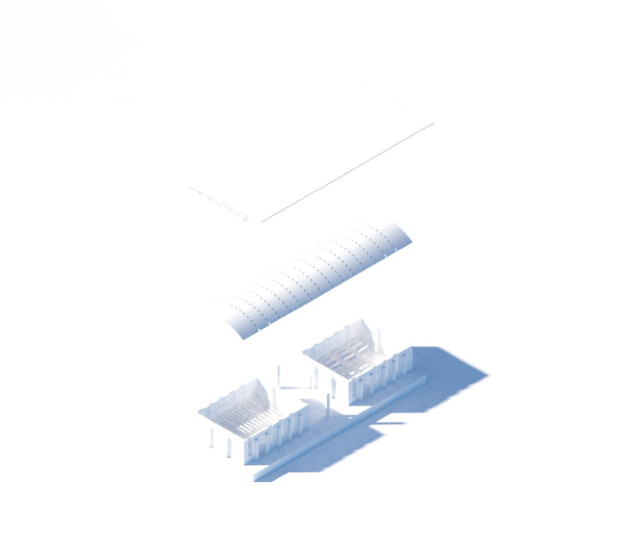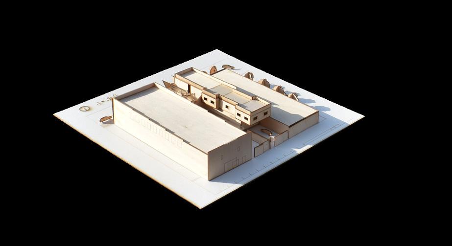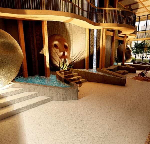 The main hall brings modernity to the museum through the glass walls which bring in light into the space, to the artifacts. The glass walls di erentiate the hall from the travertine guiding wall in the front and the white walled auditorium in the back, thus de ning the relationship between the spaces.