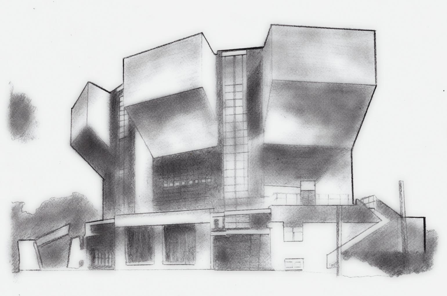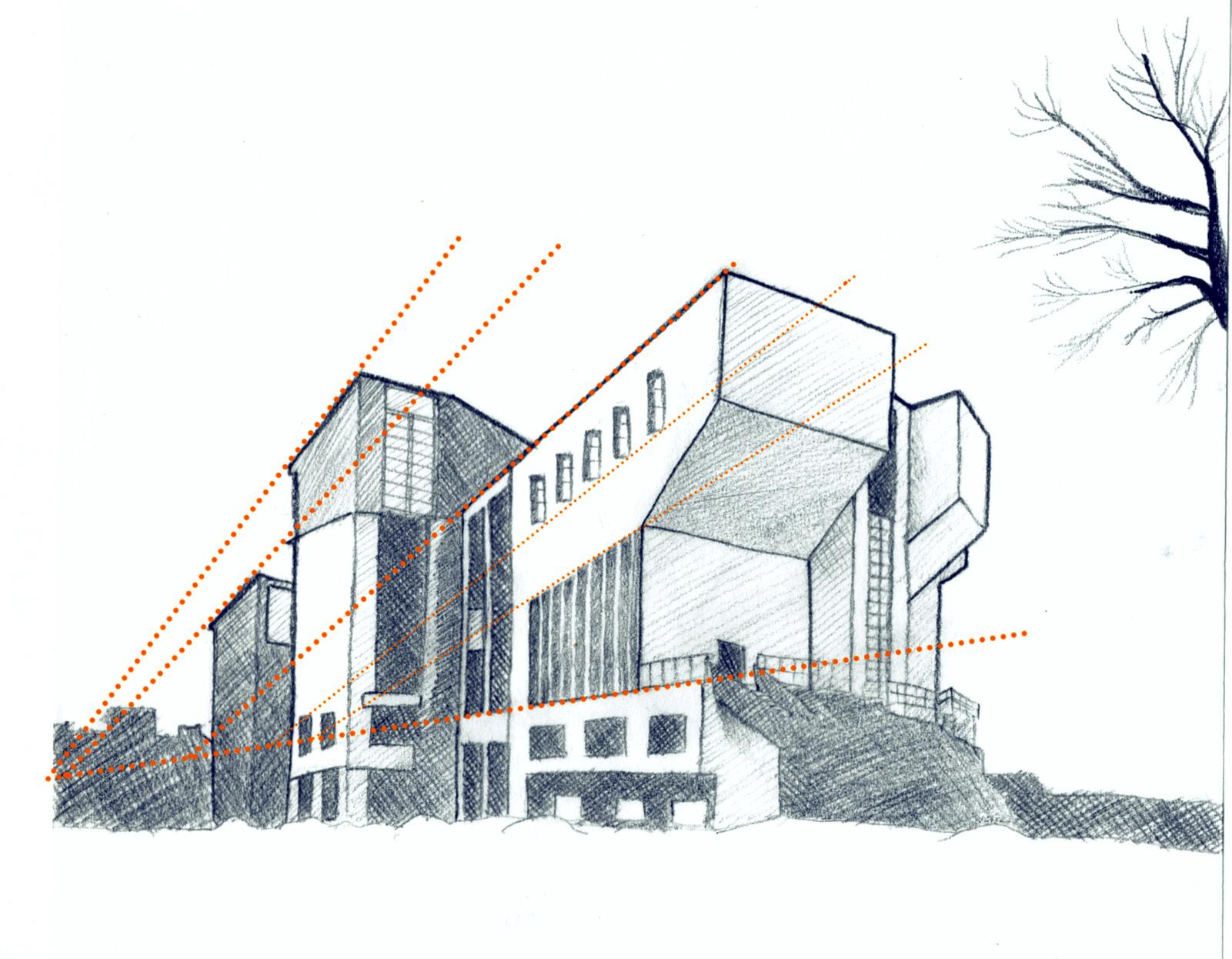 The Façade, specifically the cantilevers, are the dominant desig Standing in front, the observer really encounters the depth, the strength and defiance of the structures accentuated by the concrete.
