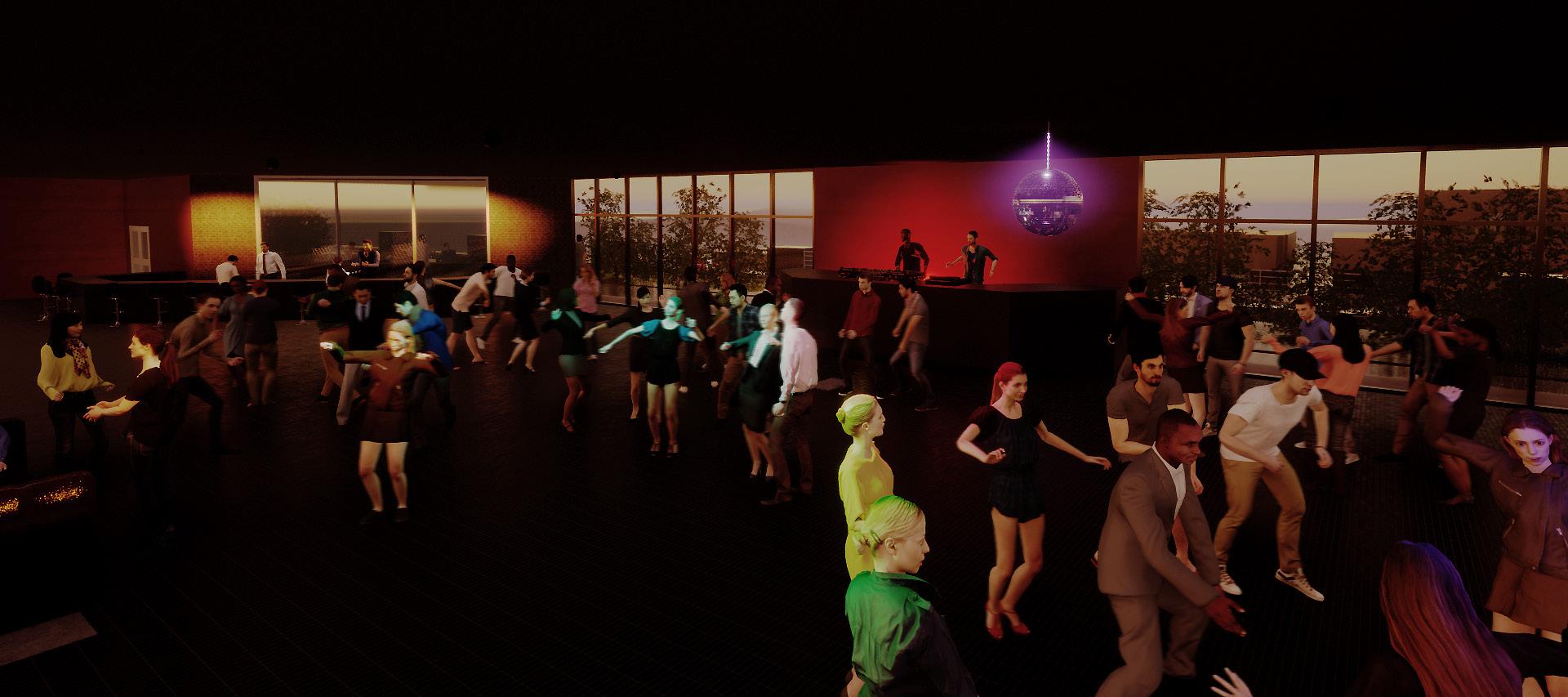 The roof is designed as a social space for bar and club goers. The exterior and the interior space can be blended using NanaWall technology. The glass walls can slide and fold, opening up the space, or can be closed based on the weather.