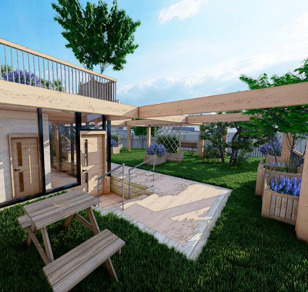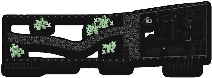The walkway is seperated by a layer of vegetation, giving a sense of privacy. The modules inside are visible, inviting the people to come into the public art gallery.