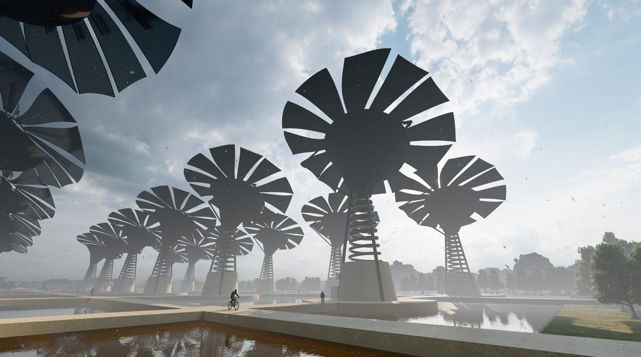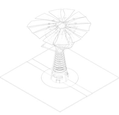 A complexly detailed, yet beautiful design that could theoretically power all the surrounding neighborhoods. The funnel system collects the heavy amount of rain and snow incident upon Chicago, and uses the heliostat system to heat the water and send it back upwards without needing electricty to pump it (inspired from an espresso machine). The hydroturbines and the solar panels generate power.