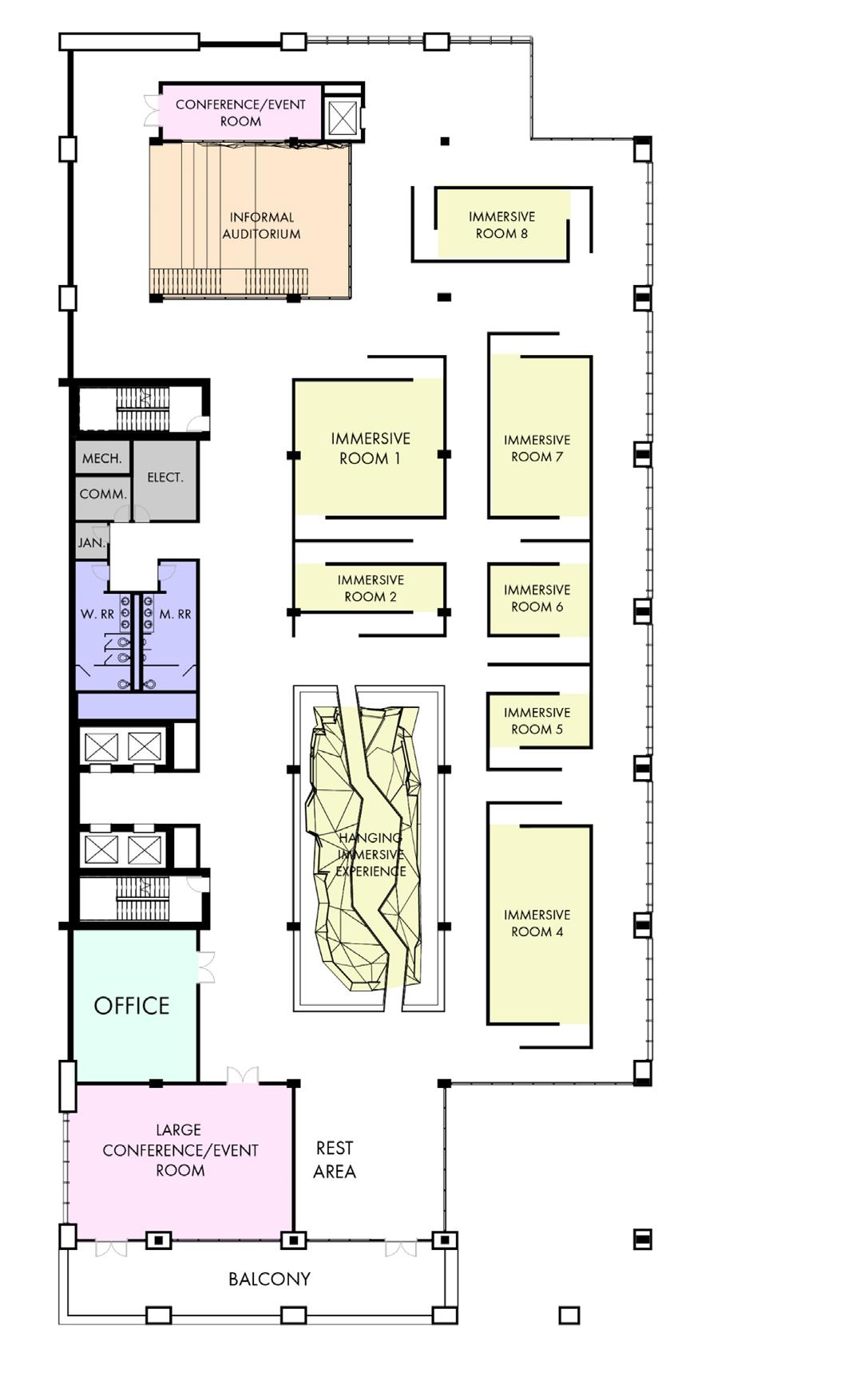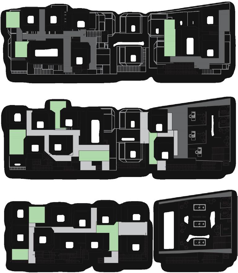 The ground floor features the gallery, the workshop, an informal auditorium and a cafeteria.
