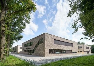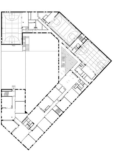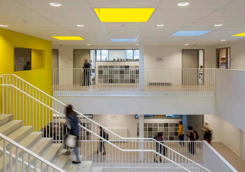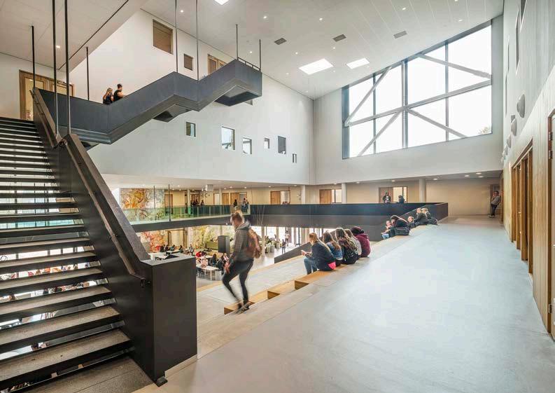 Because the new college had to find a place in the limited space between the existing school and the street, a compact layout was designed in three layers. In the centre of the building there are two large spaces: the main hall and the gymnasium above it. The rest of the programme folds itself around these spaces. Roof lights bring a great amount of daylight into the entire building.