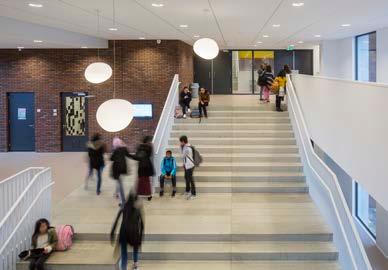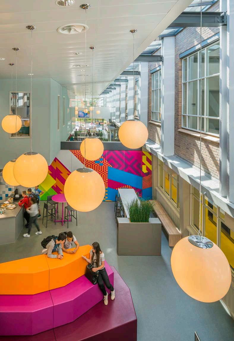 Je tiefer man in das Gebäude vordringt, desto mehr herrscht Ruhe und Konzentration. Große Schulen werden heute oft in räumliche Bereiche mit ca. 200 Schülern unterteilt. Dadurch wird die Zusammenhörigkeit unter den Schülern gefördert, da Schüler im gleichen Entwicklungsstadium jeweils zusammenhängende räumliche Bereiche erhalten. Schüler und Dozenten kennen einander. Innerhalb dieser Bereiche gibt es Selbstlernzentren, Studienzentren oder Bibliotheken, wo die Schüler gemeinsam oder individuell an Projekten arbeiten. Manchmal sind diese Räume informell, und es darf dort geredet werden. Manchmal läuft sogar das Radio. An anderen Orten geht es leiser zu. Ein solcher Ort ist der Raum, in dem Anweisungen gegeben werden oder in dem Schüler individuell arbeiten. Hier ist es am ruhigsten. Diese Räume können auch Fachräume sein.