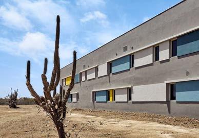 The climate of Bonaire is dry and arid. Typical of the local architecture, the large covered outdoor and overhangs. They throw shadows over the façade and outside space, which makes it possible to use it as an educational space.