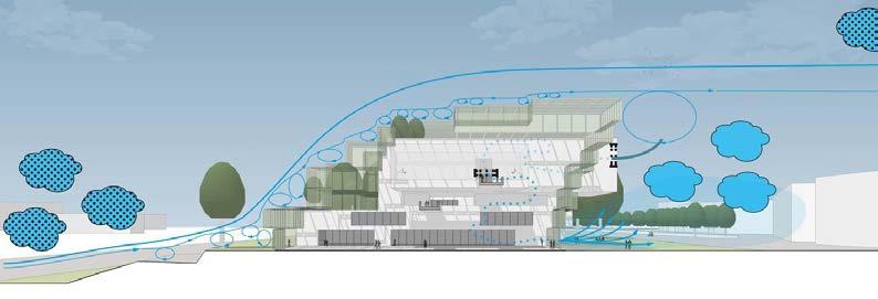 Elektrostatische Filter sorgen also für saubere Luft in den Klassenzimmern. Diese Luft wird in die Schulhöfe, die halböffentlichen Bereiche, die mit Glas überdacht sind, weitergeleitet. Von hier aus strömt die saubere Luft nach außen, um eine bessere Luftqualität im öffentlichen Raum in der Nähe des Haupteingangs zu erreichen. Der Schulhof liegt im Windschatten des schalenförmigen Gebäudes, um einen Straßenschluchten-Effekt mit sauberer Luft zu erzeugen. Wir nehmen an, dass die Form des Gebäudes die saubere Luft, die dort herausgeblasen wird, einigermaßen zurückhält, so dass sie sich nicht zu schnell mit der verunreinigten Umgebungsluft vermischt. Ob das wirklich so funktioniert, wollen wir noch in einem Windkanal prüfen. Auf diese Weise bietet der Entwurf die Möglichkeit, ein Fenster im Klassenzimmer zum halb-öffentlichen überdeckten Bereich hin zu öffnen, um Luft ohne Feinstaub oder Ruß hineinzulassen. Hierin liegen Möglichkeiten, das Programm „Frische Schulen“ mit passivem Bauen zu kombinieren. Neben den genannten Maßnahmen wurde im Entwurf alles für ein energieneutrales und angenehmes Schulgebäude getan wie z. B. die Anwendung einer Algenfassade als Sonnenschutz und Bioreaktor, eine Fertig-Holzkonstruktion für eine saubere Baugrube während der Bauphase, ein angenehmes Raumklima und eine „Löcherdecke“ (für eine angenehmere Luftzufuhr im Innenbereich). Auch die Reduzierung von Schadstoffemissionen aus Baustoffen und Möbeln ist eine Bedingung.