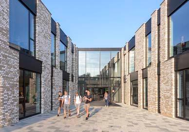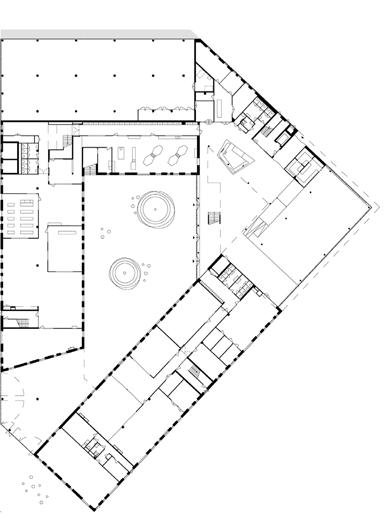 The patios, one of the characteristic elements of the old building, are back in the new building. They bring light deep into the building, provide the opportunity to teach outdoors and refine the scale of the contour, thus matching the grain of the environment.