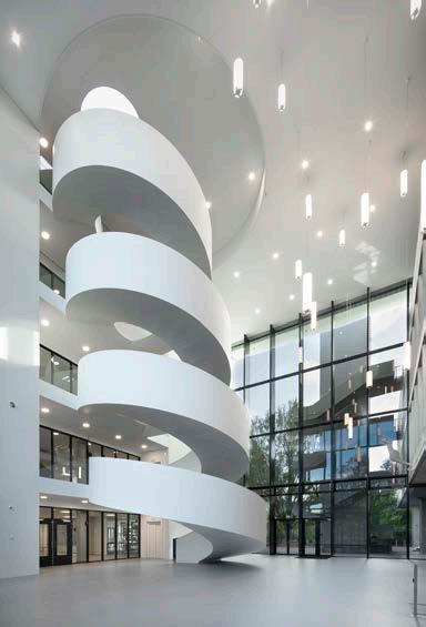 The monumental staircases feature sound absorbing wall panels, an artwork by