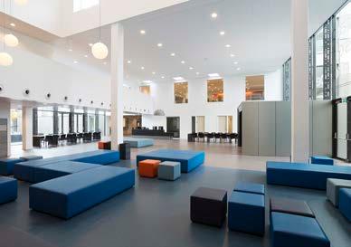 Het interieur dat eveneens door atelier PRO is ontwor pen, is opvallend strak en smetteloos wit uitgevoerd. Bij alle aansluitingen van wanden en balustrades op vloe ren en trappen zijn zeer strakke en doordachte details doorgevoerd. De ruimtelijke beleving van dit gebouw is door het inventieve kleurgebruik en het vele daglicht bijzonder aangenaam.