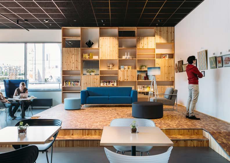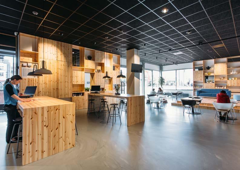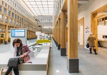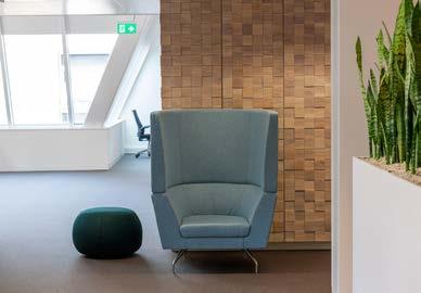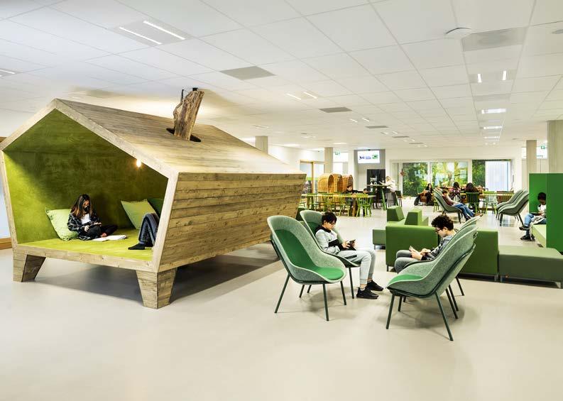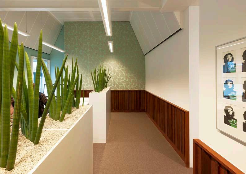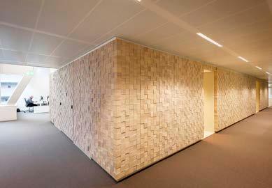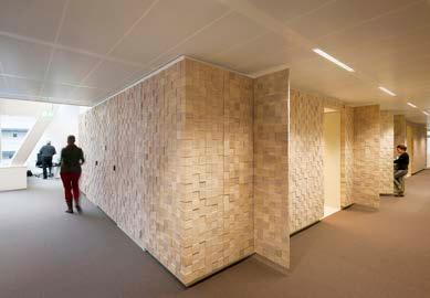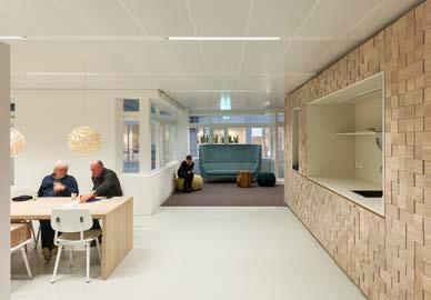 Transparante puien bij de centrale split-level trappen huizen versterkt het zicht naar andere verdiepingen en vormen zo belangrijke plekken voor ontmoeting. Naast de trappenhuizen zijn ‘huiskamers’ geplaatst waar medewerkers samen komen voor koffie, een informeel gesprek of afdelingsbijeenkomst. Hier zijn ook de facili taire voorzieningen zoals panty’s, printers en toiletten. De kleurfamilie van groenen, gelen en blauwen corres pondeert met de ontspannen omgeving van Ede. Lichte natuurlijke tinten bij werkruimten (rust) afgewisseld met kleurige huiskamers (ontmoeting). Houten latten bij de concentratie- en overlegruimten zorgen voor privacy. Leuk detail zijn de verrijdbare krukjes op de werkvloer afkomstig uit de bossen van Ede.