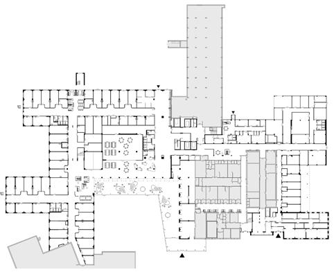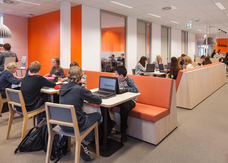 Vlnrr: studiewerkplek met zicht naar kantine, lokalen cluster, centrale hal