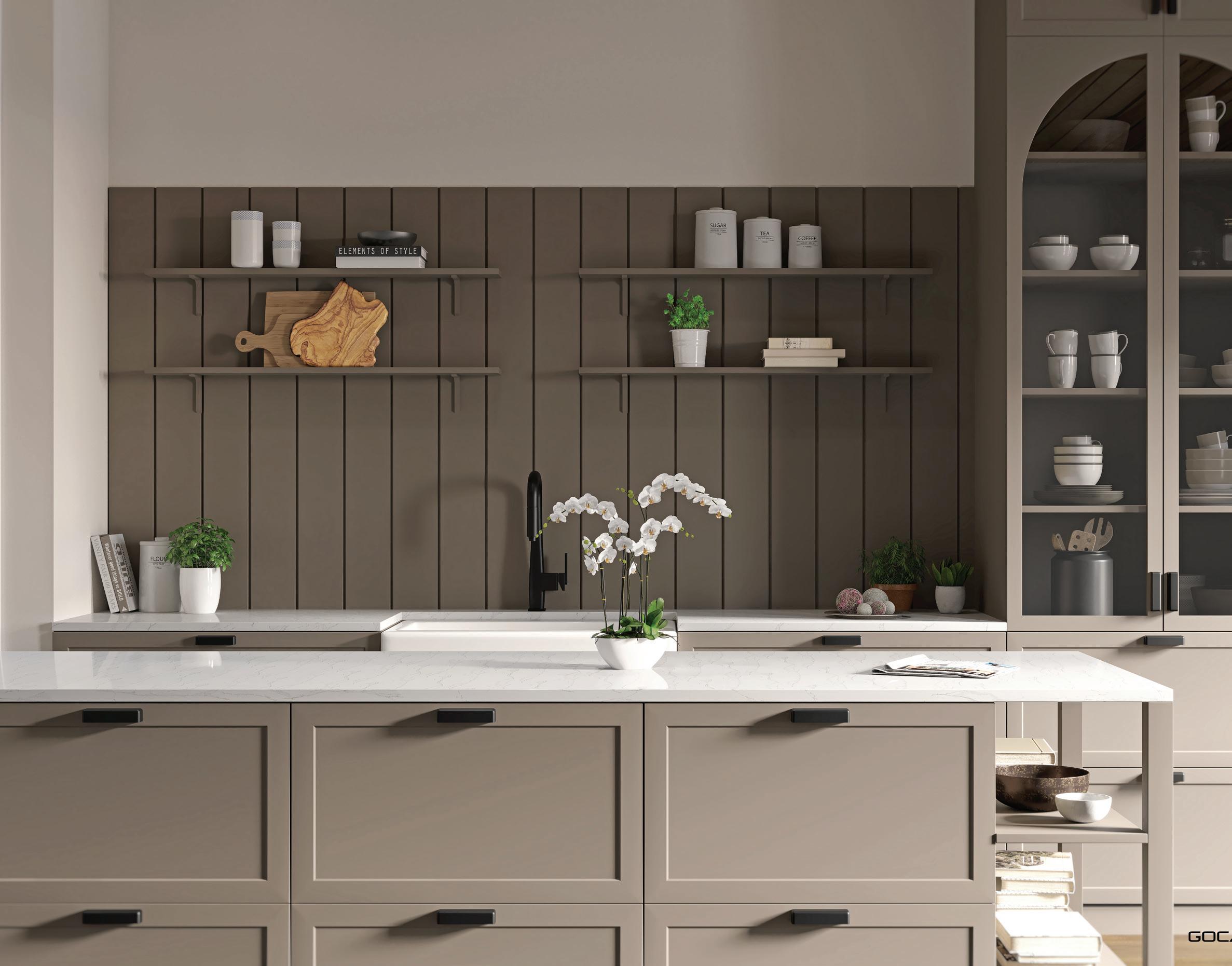 La quincaillerie dorée choisie pour les poignées et le robinet crée un contraste subtil avec les tons gris du comptoir. Elle apporte également une touche de sophistication supplémentaire à l’espace.