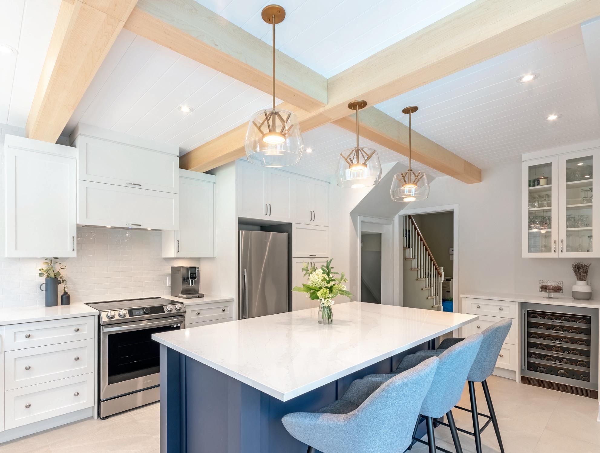 Mission réussie pour cette cuisine rénovée que l’on souhaitait aérée, lumineuse et intemporelle ! En effet, grâce au blanc omniprésent dans les matériaux ainsi qu’au design classique des armoires, de l’îlot et de la hotte, on s’assure d’avoir un décor qui réfléchit bien la lumière et qui saura perdurer. Il n’aura fallu que quelques touches de noir et de bleu pour terminer la signature de cette cuisine contemporaine au charme classique juste assez chic !