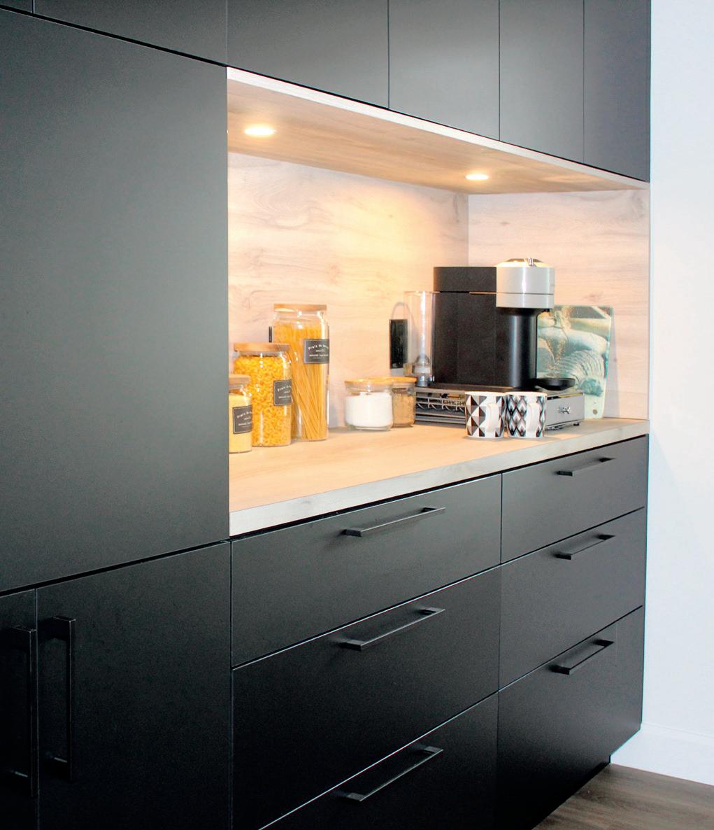 Un petit garde-manger walk-in est toujours une pièce bien appréciée, surtout lorsqu’il est aussi design et fonctionnel. Tablettes flottantes, tiroirs profonds et comptoir en angle permettent d’avoir tout à portée de main, puisque la cuisinière est de l’autre côté de la porte.