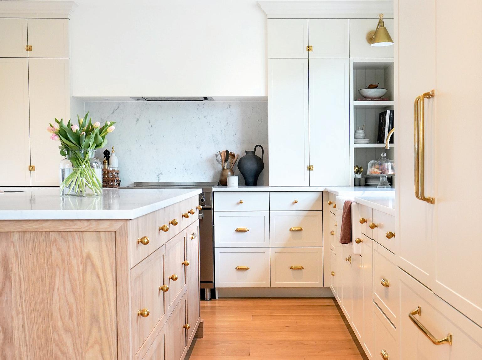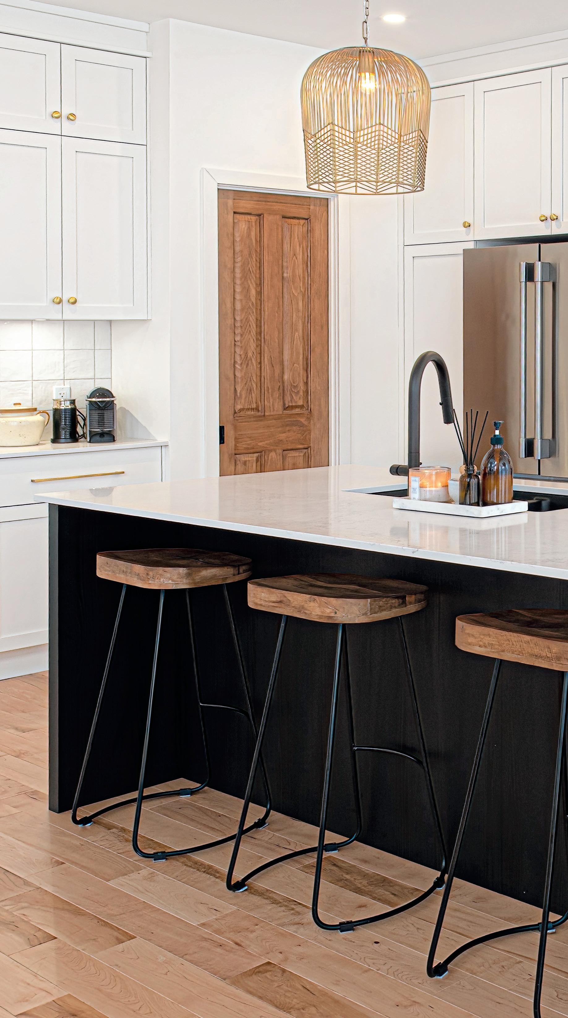 Dans l’aire ouverte de cette maison, la cuisine brille comme un joyau intemporel orné de quelques détails éclectiques qui invitent au voyage. La hotte en forme de caisson blanc au look contemporain entourée de tablettes de merisier est le point focal du décor. Elle permet de mettre en valeur de jolis accessoires qui s’accordent avec le dosseret en céramique artisanale émaillée blanche. Entouré d’armoires de style shaker blanches et discrètes, l’îlot noir se démarque par son style plus moderne et ses panneaux planes. Le bois teint apporte une touche de chaleur, tandis que les poignées et les luminaires dorés ajoutent de la douceur au décor. Ce design évoque l’envie de voyager des proprios; un désir de se sentir à Bali et un clin d’œil à la Chine.