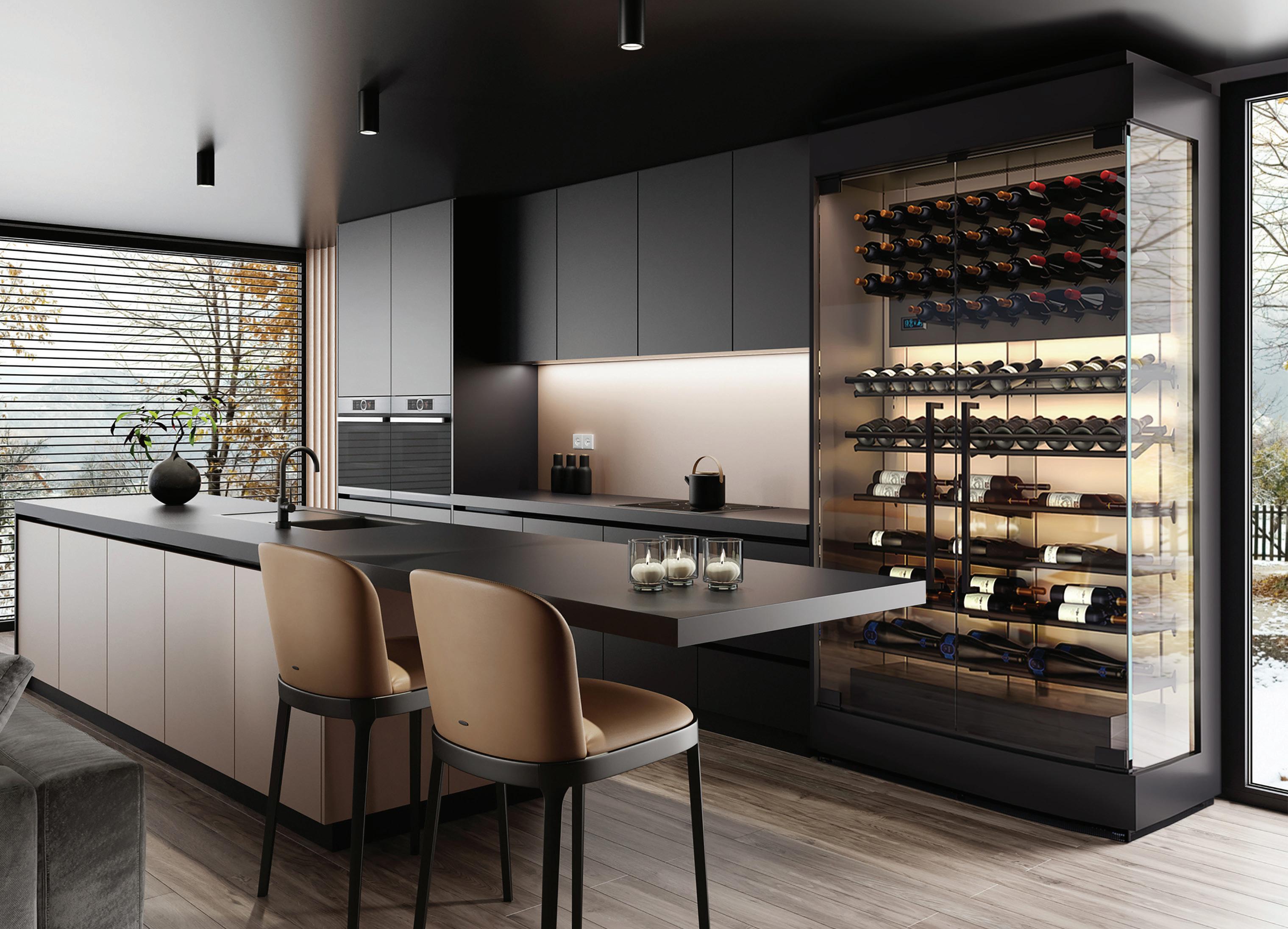 Le cellier est bien intégré dans l’unité murale, s’agençant à merveille avec les autres électroménagers qui la composent.