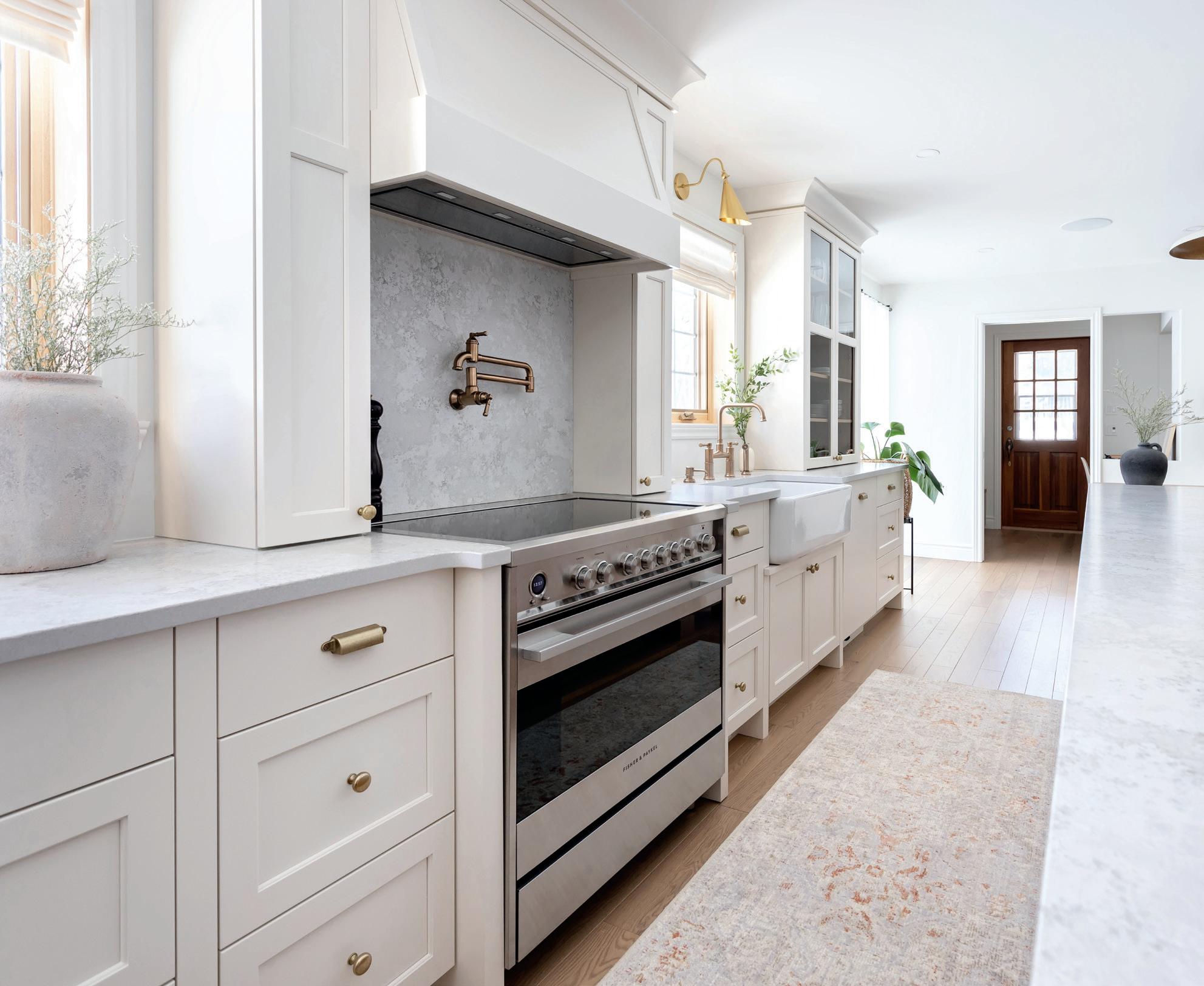 Le coin cuisson arbore une section d’armoires grises sans poignées tandis que le reste de la cuisine est blanc avec une fine moulure shaker. Ce contraste subtil se marie bien avec le choix du quartz aux tons de pierre.
