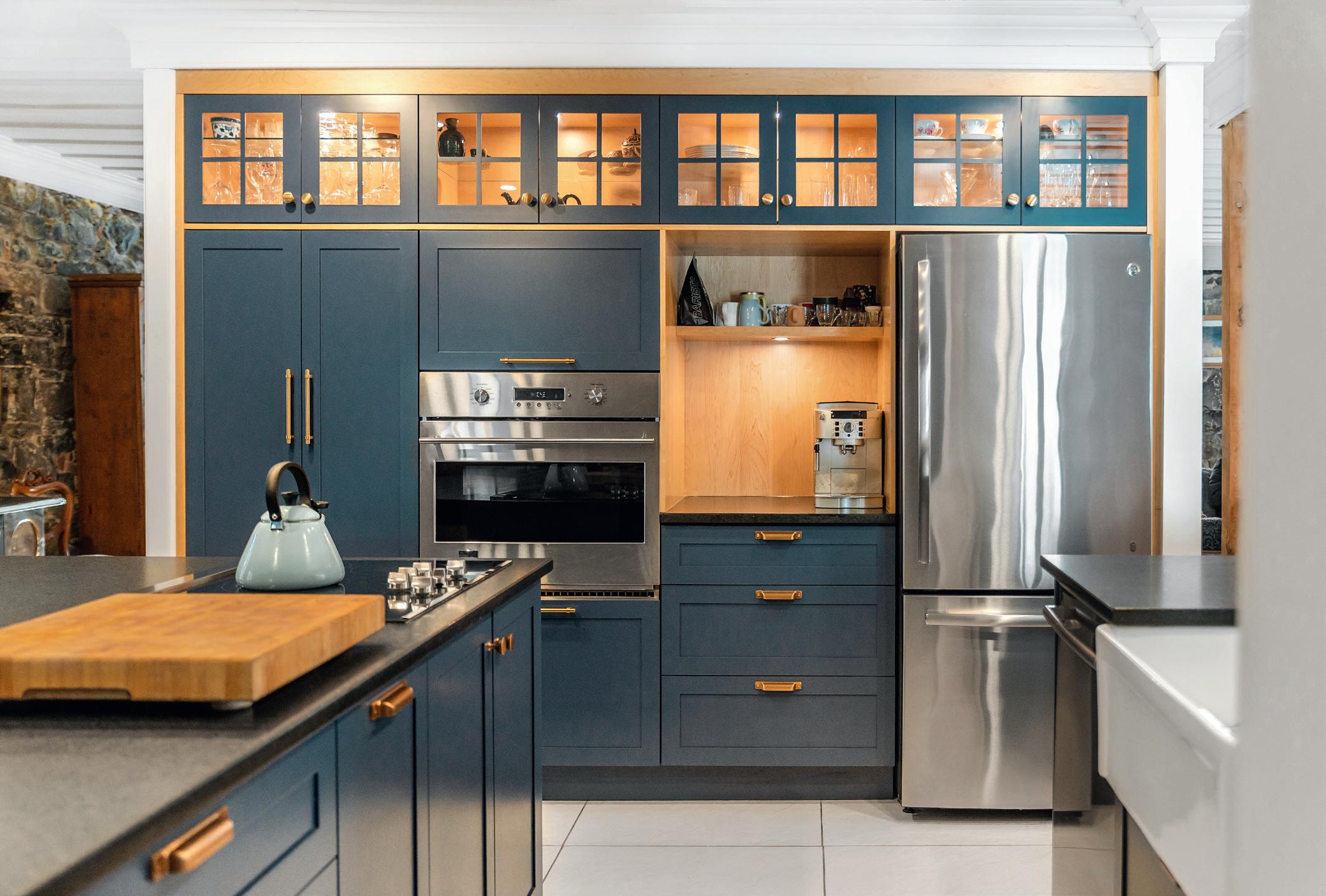 Située au cœur d’une maison ancestrale rénovée, cette splendide cuisine intègre harmonieusement les éléments architecturaux d’origine (murs en pierre, plancher en bois et plafond orné de moulures). Les matériaux variés, dont le merisier laqué bleu, l’érable calico naturel et les comptoirs en pierre, s’accordent élégamment avec l’ambiance historique de la maison. Le tout donne un espace ouvert et fonctionnel au cachet incroyable !