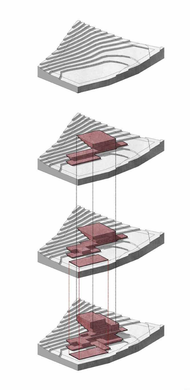 The massing starts with organizing the public places and placing them accordingly first to facilitate circulation.