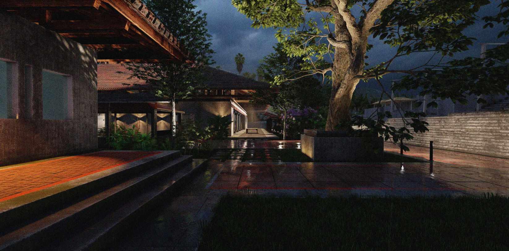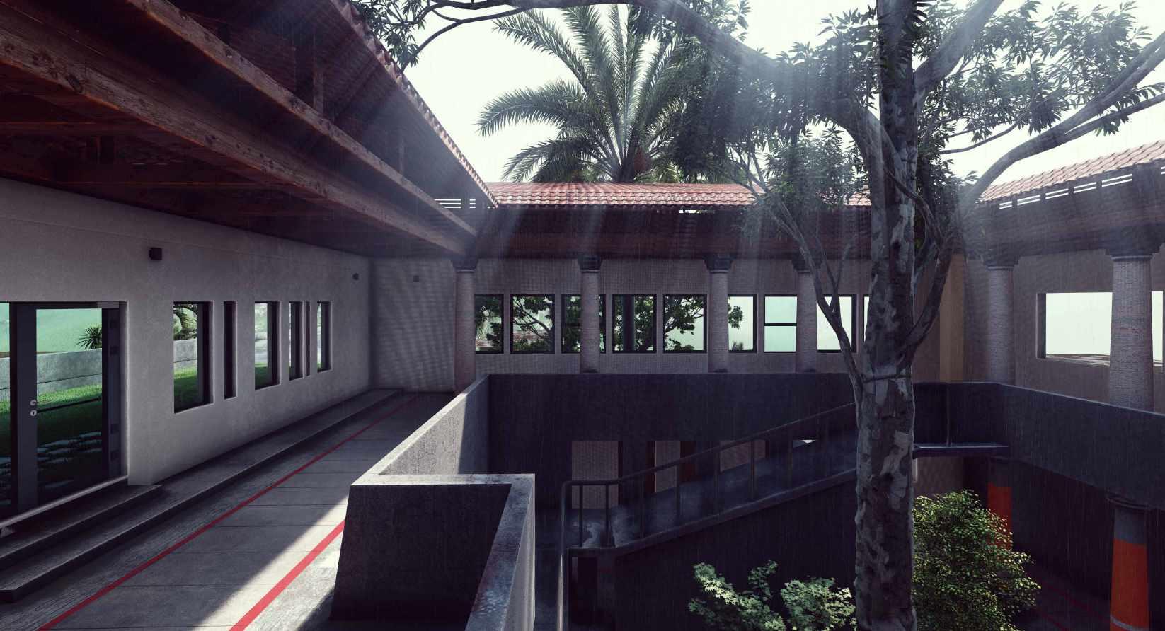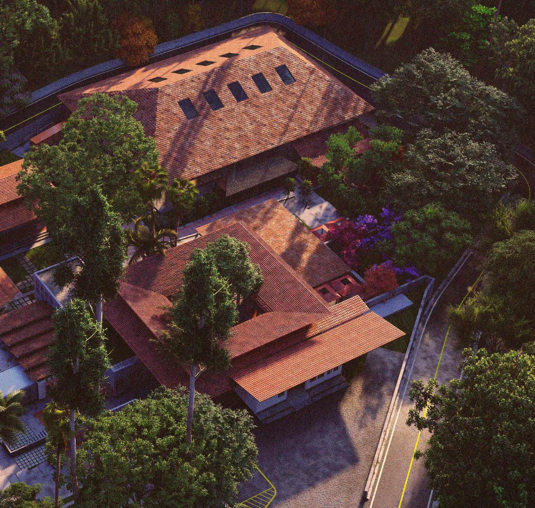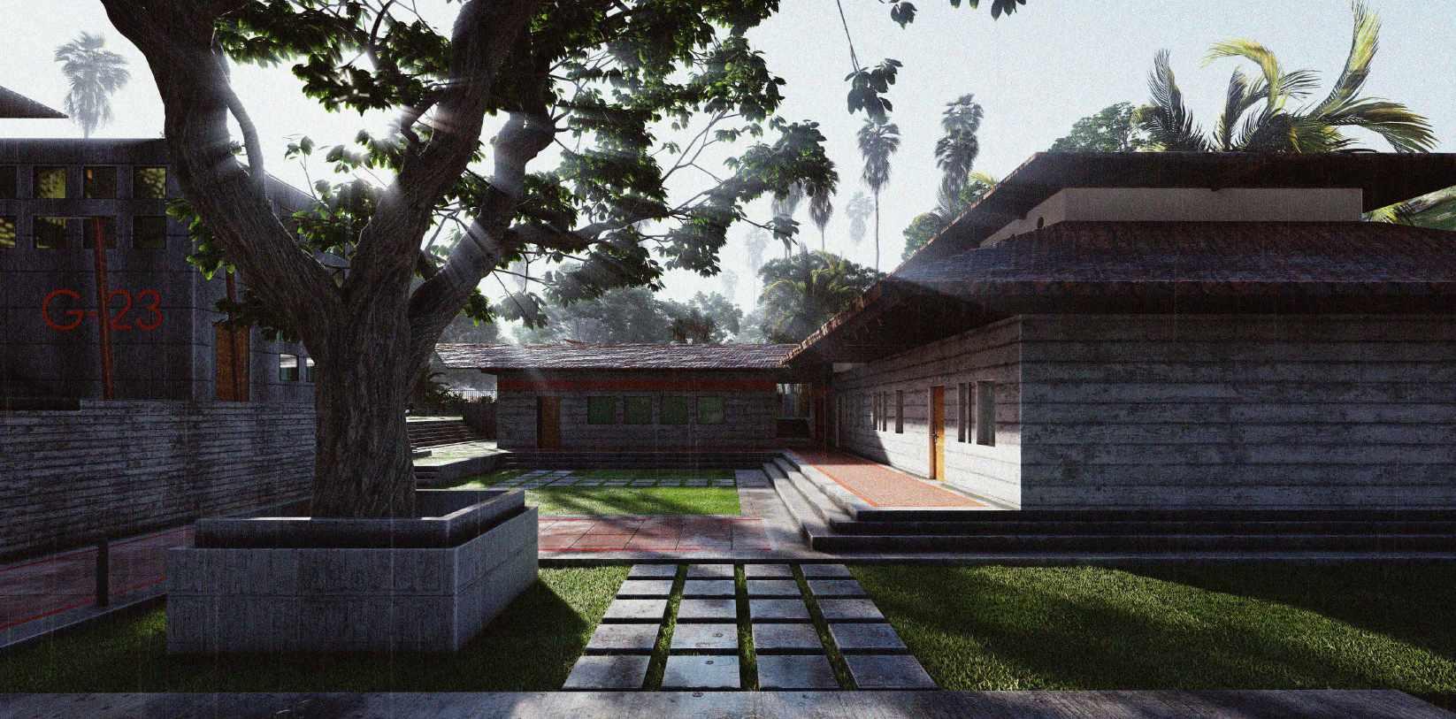 The buildings have been designed in the native vernacular style of architecture prominent in Kerala. There is no fixed visual axes instead the circulation design gives a sense of community awareness by incorporation open spaces which act as social interactive spaces.