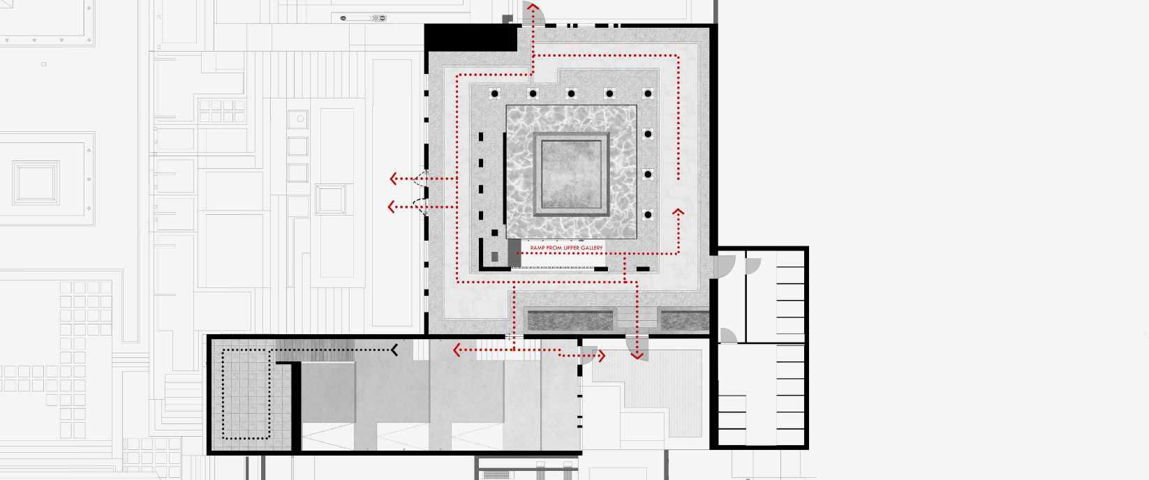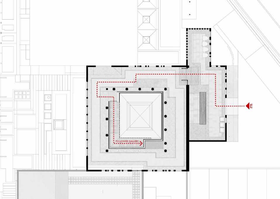 1. Ramp from upper gallery 2. Gallery walkway & exhibition area 3. Island 4. To mini OAT 5. To rest of the site 6. To community library 7. To main OAT & Cafe 8. WC/F 9. WC/M 10. Community Library 11. Mezanine floor