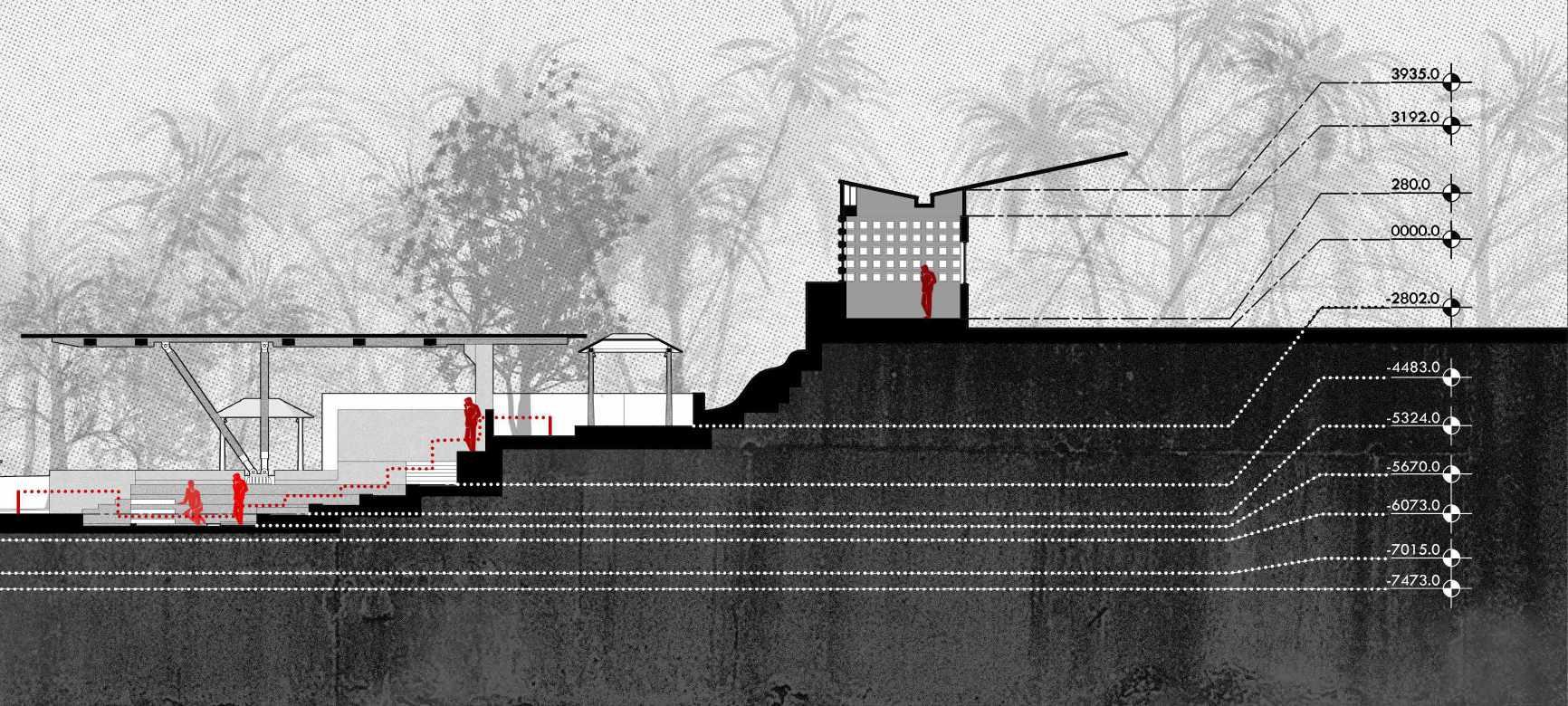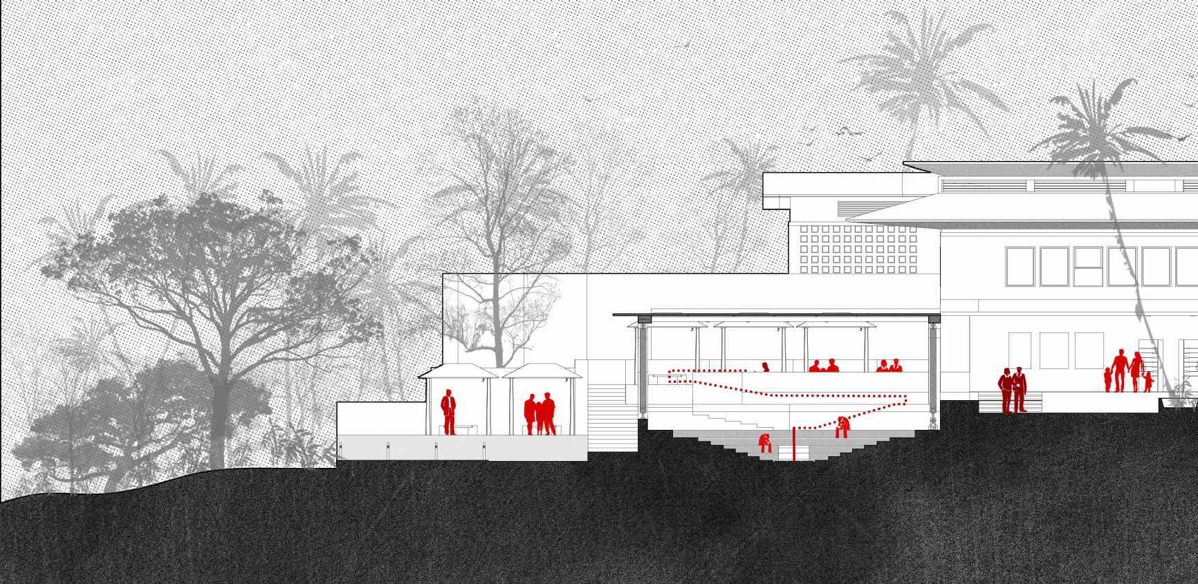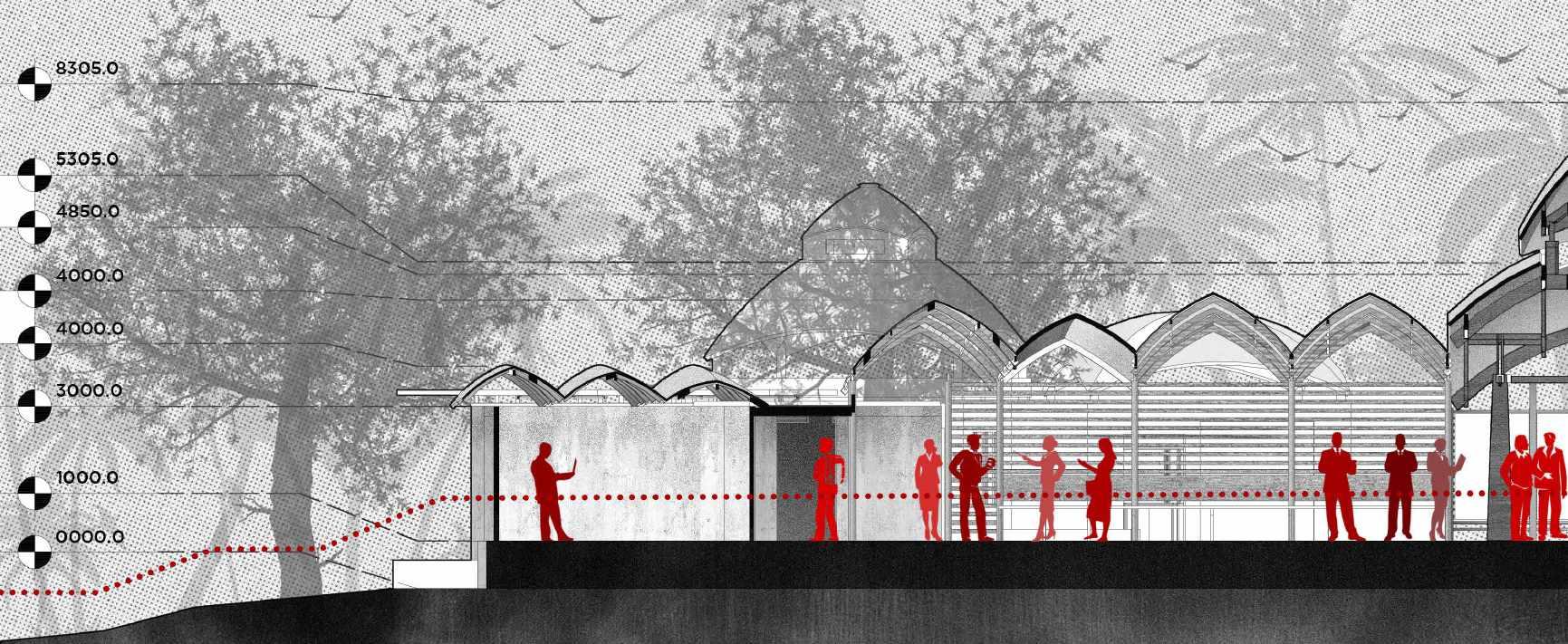 The massing of the Lobby, Gallery & Exhibition, Library, mini OAT and Main Handloom block is made along with social spaces for community interaction, placed accordingly following the sloping terrain profile of the site.