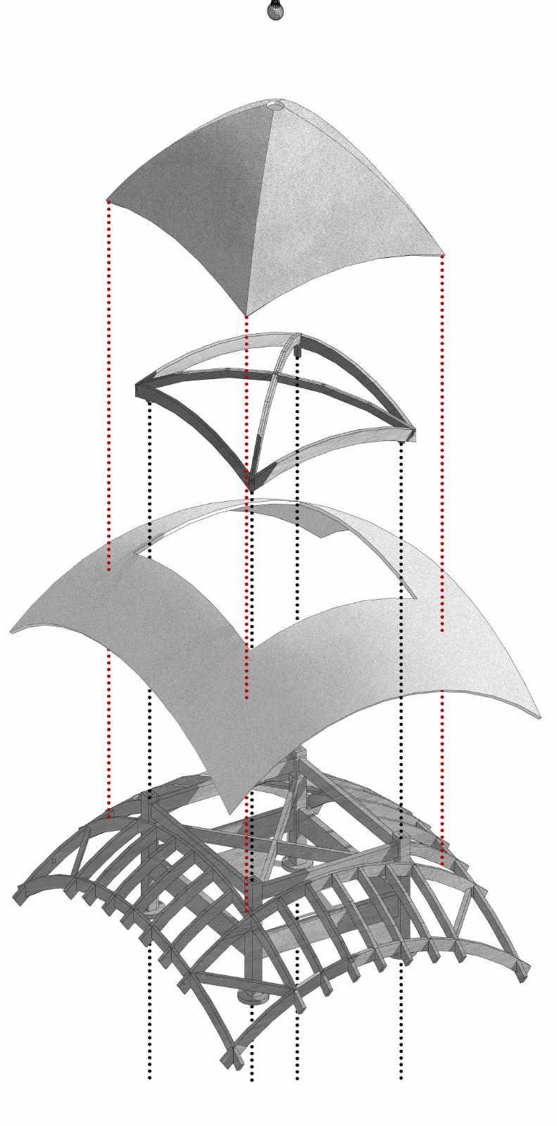 4. The wooden framework which supports the bottom half of the roofis a designed and engineered to support the rest of the upper half. Four columns make it stand on ground.