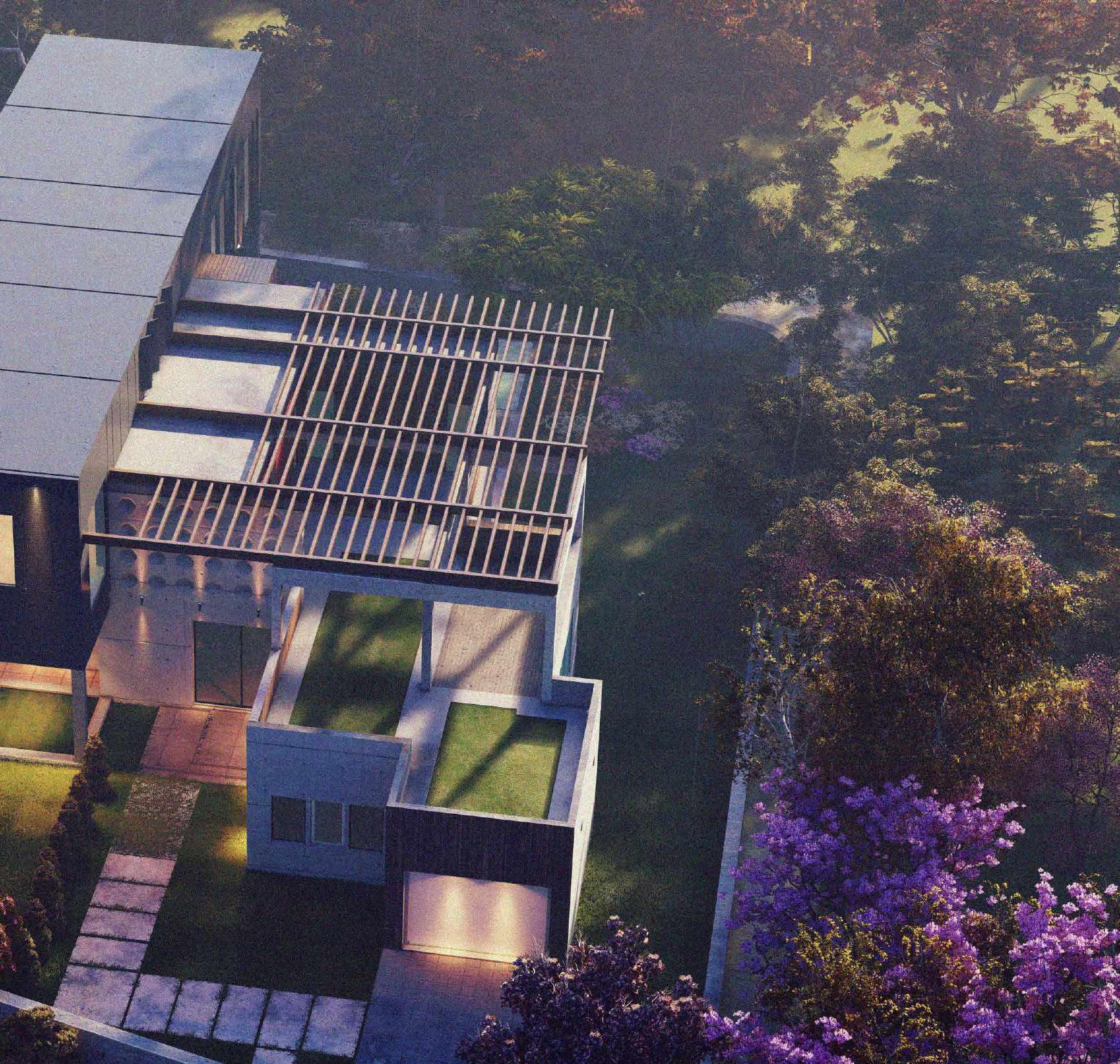 1. Front entry 2. Parking garage 3. House entry 4. Art installation 5. Backyard 6. Working studio 7. Garden terrace 8. Terrace sa=hading 9. Steel girder frame 10. Aluminium cladding 1 2 3 5 4 6 7 8 9 10