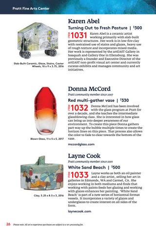 Red multi-gather vase | $330 Donna McCord has been involved with the glass program at Pratt for over a decade, and she teaches the intermediate glassblowing class. She is interested in how glass can bring us into deeper awareness of our environment. To create this piece Donna gathers part way up the bubble multiple times to create the horizon lines on this piece. That process also allows the color to fade to clear towards the bottom of the vase.