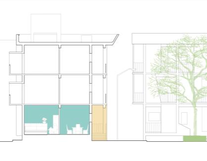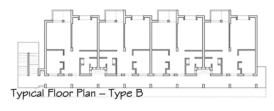 • On upper floors, four ‘one-bedroom’ apartments are strung along this corridor space, at the end of which sits an open staircase.