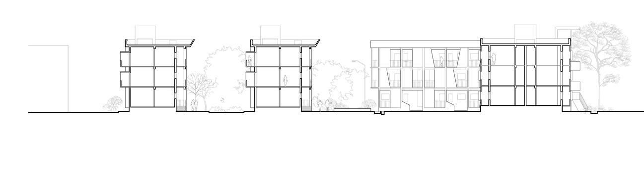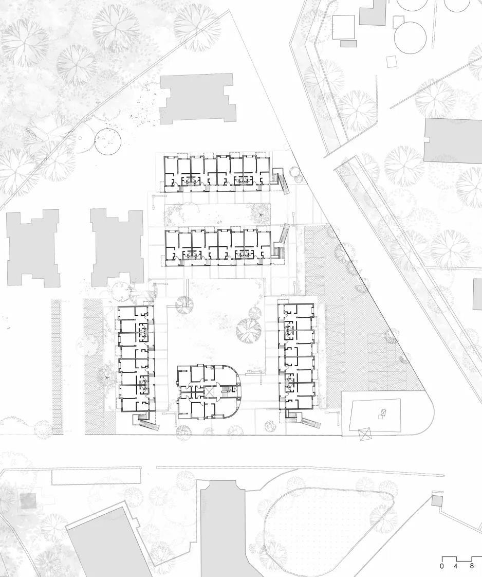 Three Type B blocks come together along with one semicircular Type A ‘two-bedroom’ block to form an intimate courtyard which becomes the heart of the housing.