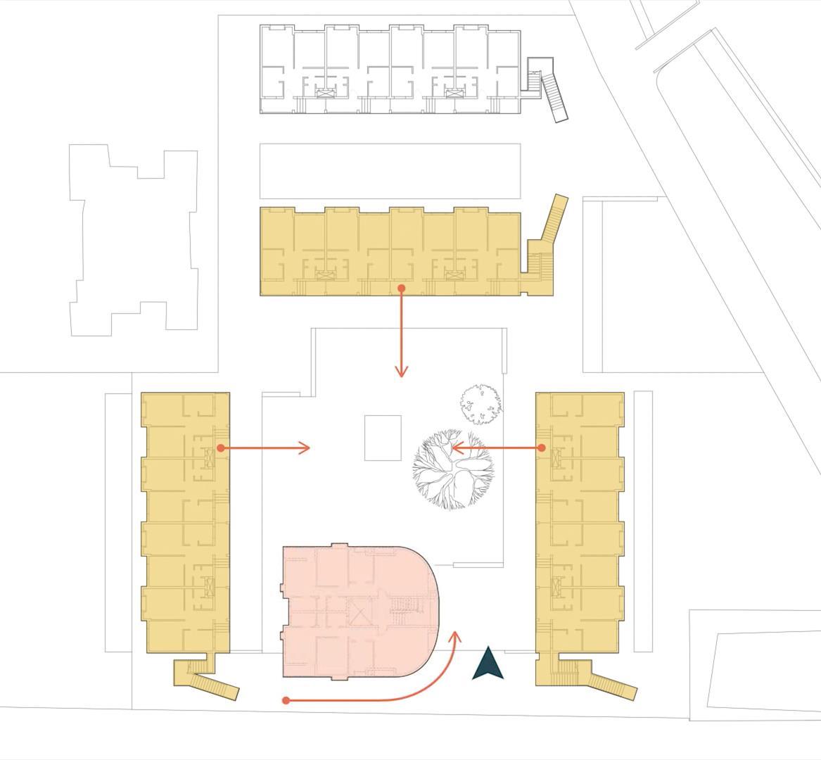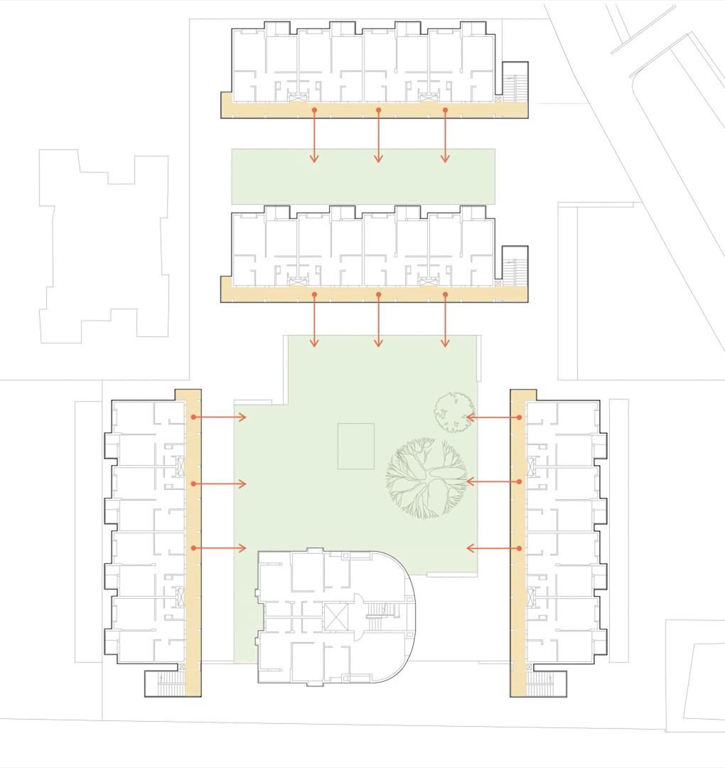 • On the ground floor, apartments are accessible individually from their own small semi-private space, or “otla” (raised entrance plinth seen in traditional houses). Olta acts like a semi public space between the inside and outside.