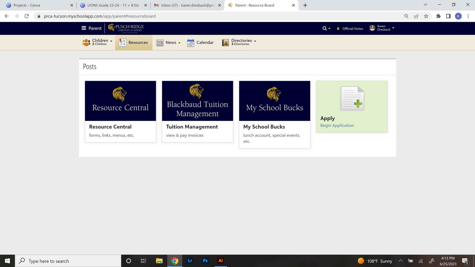 Find school supply lists, dress code information, and the PRCA Spirit Store under 'Resources' in Lions Den.