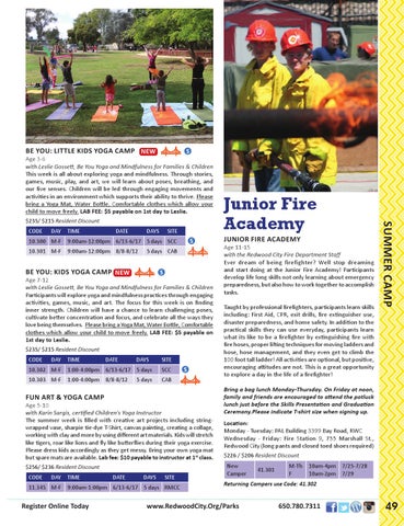 Bring a bag lunch Monday-Thursday. On Friday at noon, family and friends are encouraged to attend the potluck lunch just before the Skills Presentation and Graduation Ceremony.Please indicate T-shirt size when signing up. Location: Monday - Tuesday: PAL Building 3399 Bay Road, RWC Wednesday - Friday: Fire Station 9, 755 Marshall St., Redwood City (long pants and closed toed shoes required) $226 / $206 Resident Discount New Camper