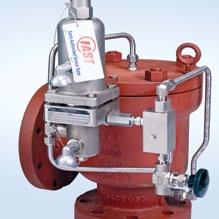 As system pressure reaches set pressure, the force acts upon the surface area of the pilot control disc, overcoming the spring force in the pilot valve, and the pilot valve lifts. As the seat assembly in the pilot control begins to lift, it seals off the flow of pressure to both the vent and the main valve dome. At the same time, the pressure in the dome is released through the pilot vent. Once the pressure in the main valve’s dome has been released, the system pressure, acting on the bottom of the piston, will lift the piston and relieve system pressure until normal process conditions are restored.