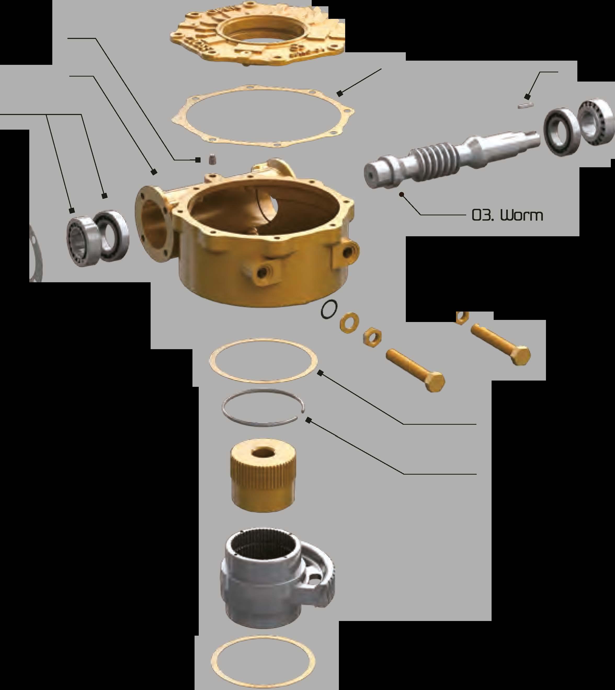 The Worm is supported on tapered roller bearings which support both the axial and radial forces generated by the gearings.They have excellent load bearing capacity.