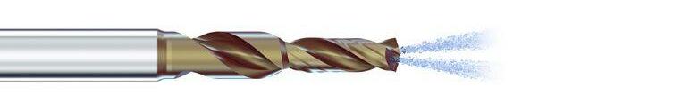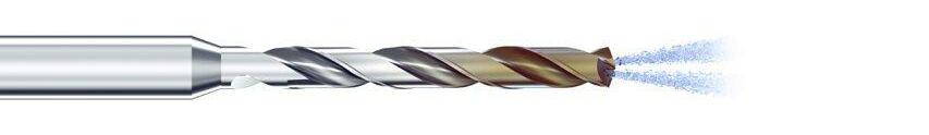 Zwei speziell konzipierte Kühlkanäle mit sehr grossem Querschnitt führen massiv Kühlschmiermittel zur Bohrspitze, um eine überhöhte Temperaturbelastung der Schneiden zu verhindern. Die patentierte Sonderform der Kühlkanäle ermöglicht bis zu 4-mal höhere Kühlmittelmenge (gegenüber konventionellen Kühlkanälen) bei gleichem Druck. Gleichzeitig spült der massive Kühlmittelstrahl die Späne durch die Spannuten und verhindert jede Form von Spänestau.