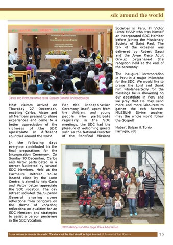 sdc around the world Societies in Peru, Fr Victor Livori MSSP who was himself an incorporated SDC Member before joining the Missionary Society of Saint Paul. The talk of the occasion was delivered by Robert Gauci and the Jorge Preca Adult Group organised the reception held at the end of the ceremony.