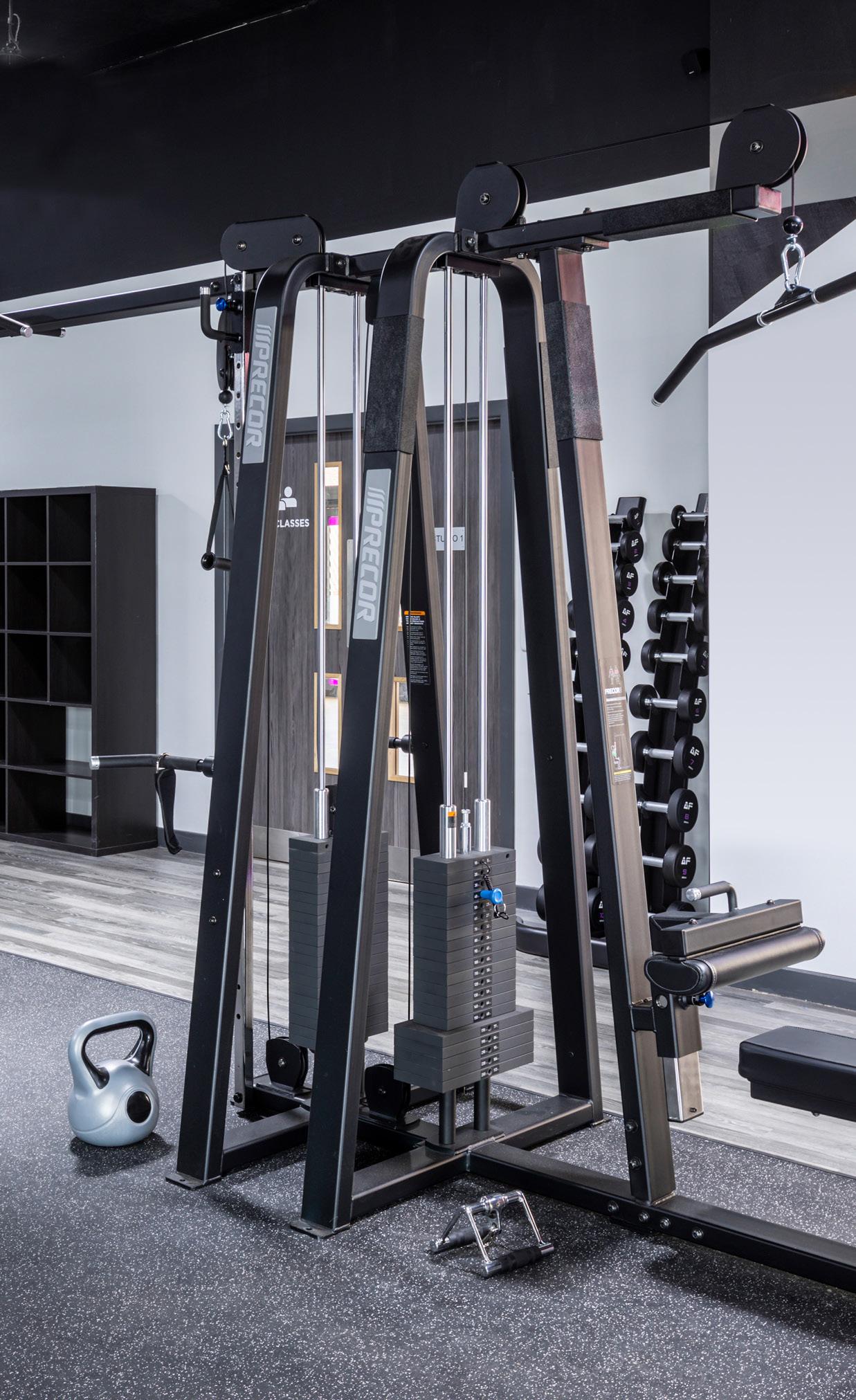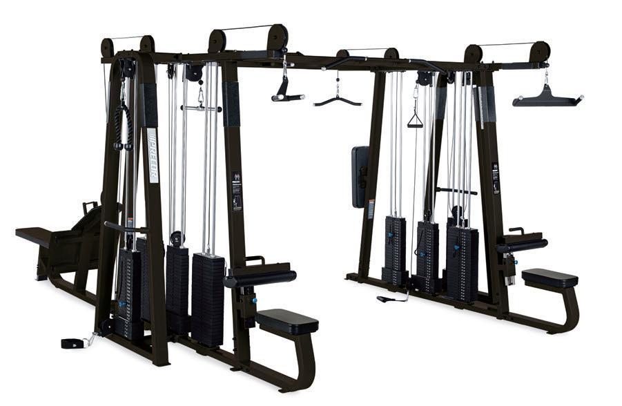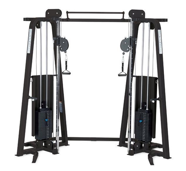 Icarian Multi Station weight stack shrouds are not available in all configurations. Cable Crossover has two Adjustable Hi/Lo Pulley stations connected by an overhead beam with pull-up bar