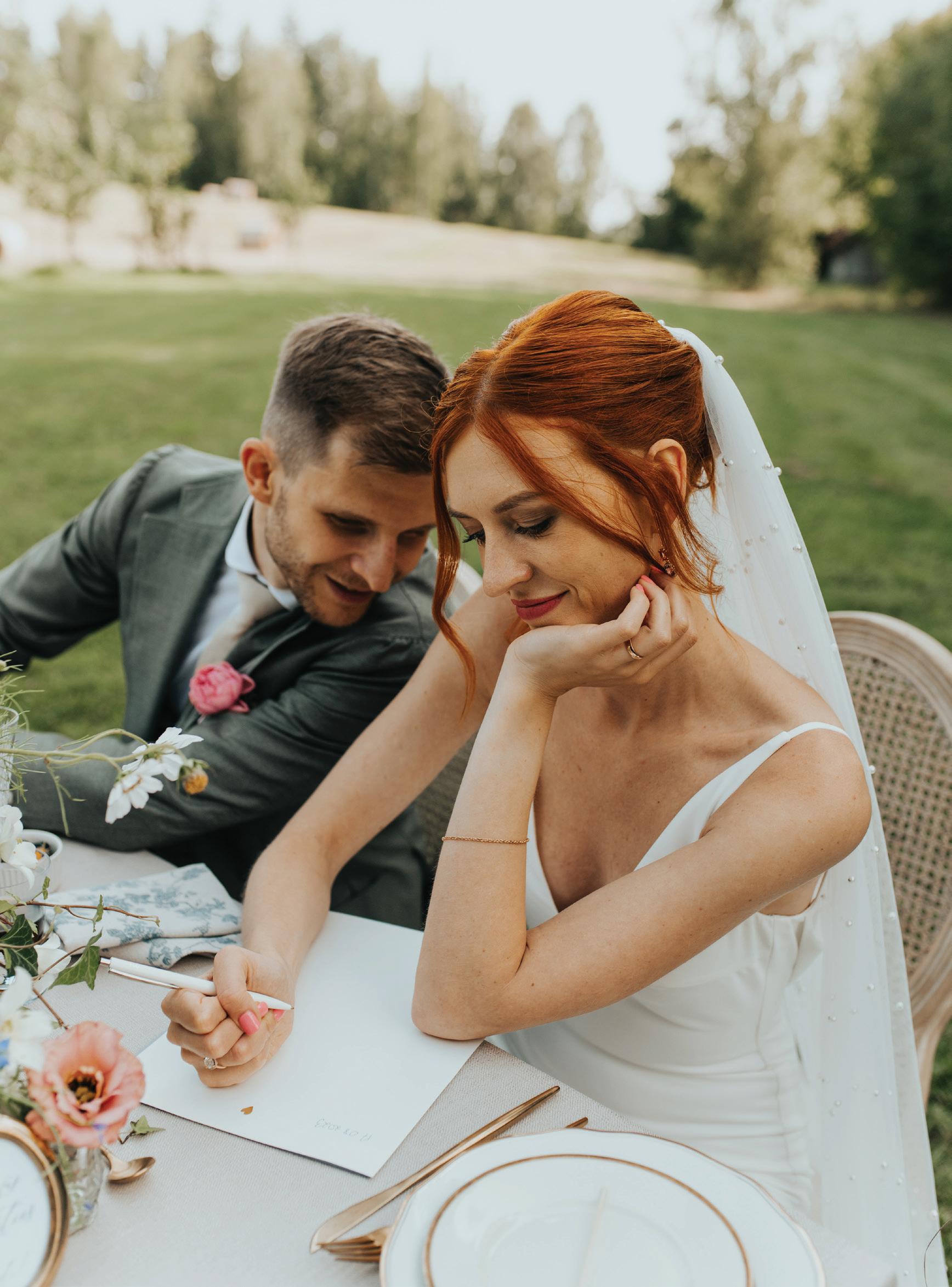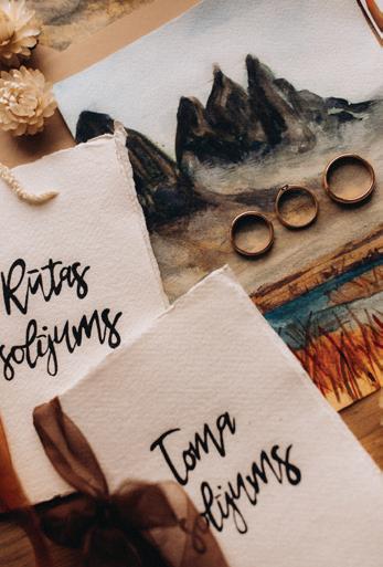 Iesakām rakstīt pašiem savus laulību solījumus. Tas ir personiski, noteikti paliks atmiņā un sildīs sirdi arī pēc gadiem, kad tos varēsiet pārlasīt. Solījums var būt esejas garumā, un tie var būt vien daži teikumi. Mūsu gadījumā solījumi nebija nekādi nopietnie romāni vai lietas, ko solām līdz mūža galam. Tie bija rotaļīgi, mīļi, ar humoru, balstīti uz tā rīta emocijām.