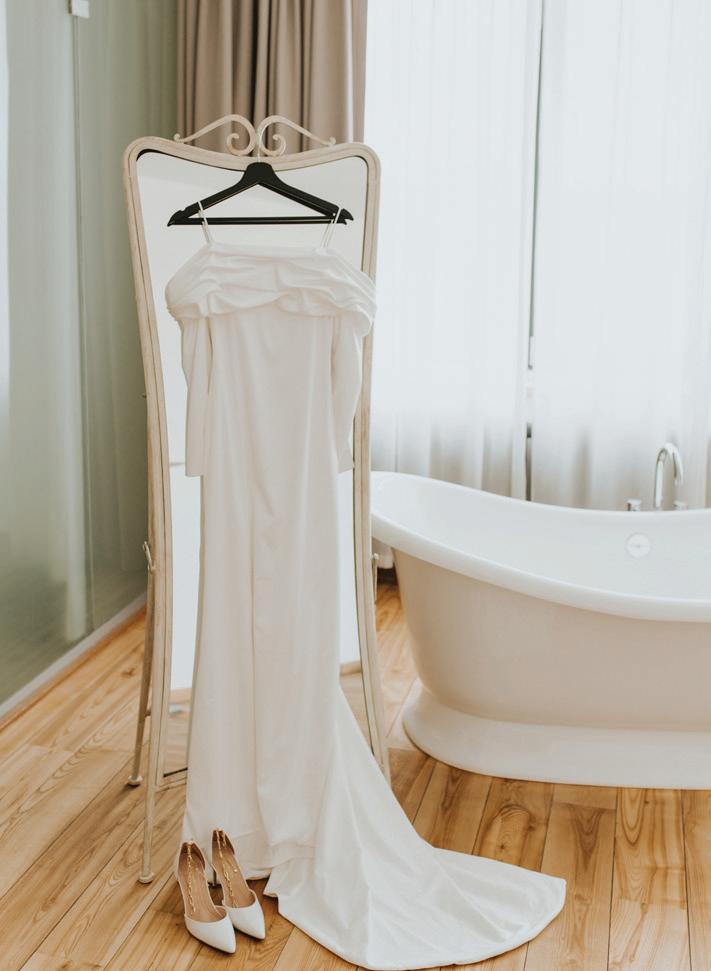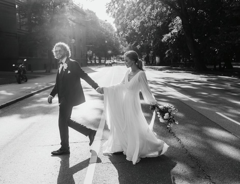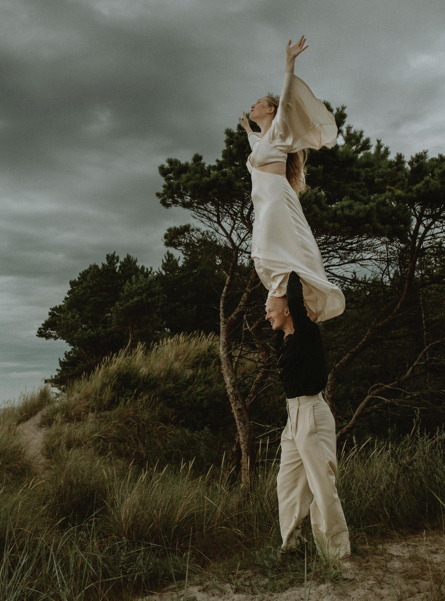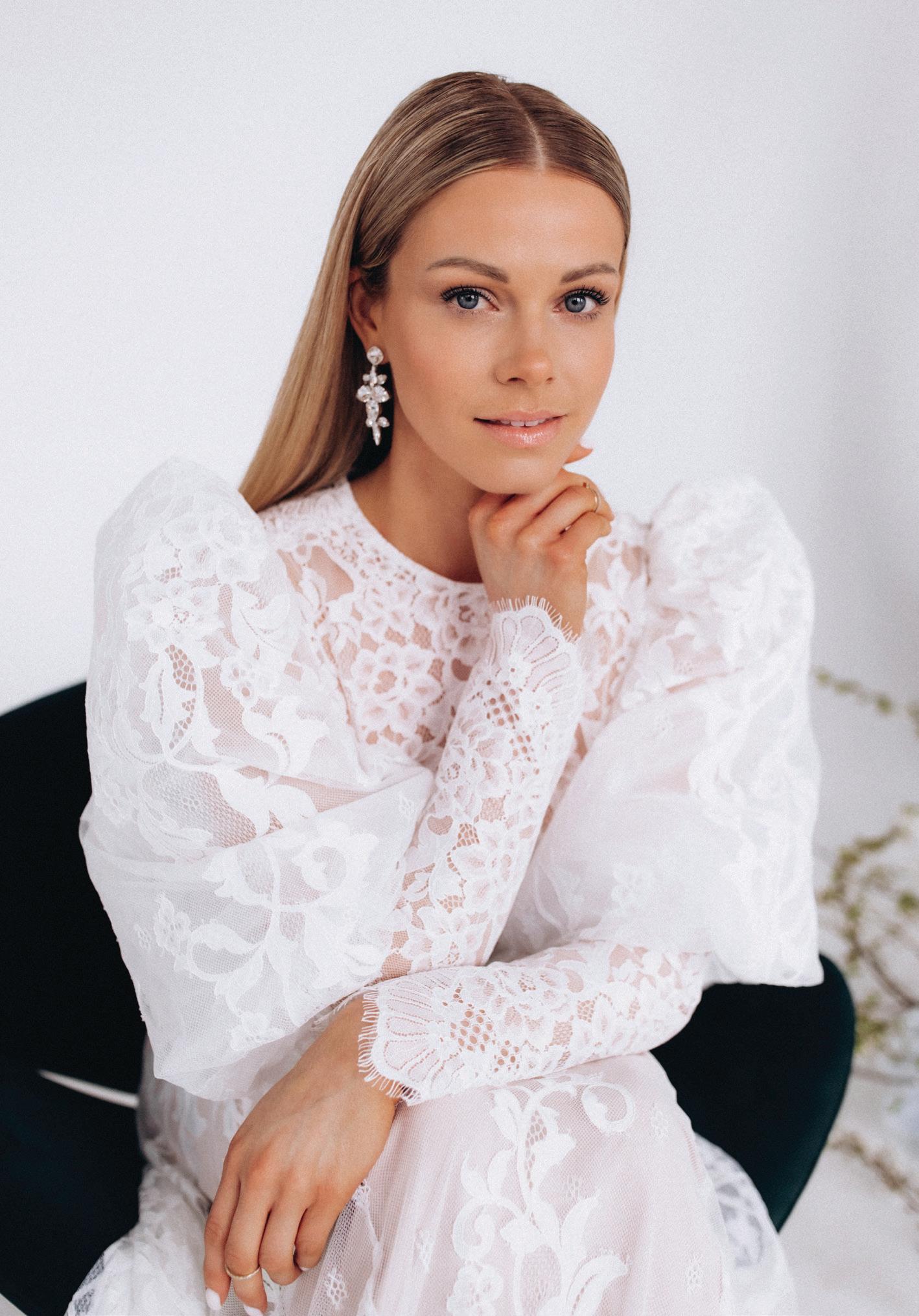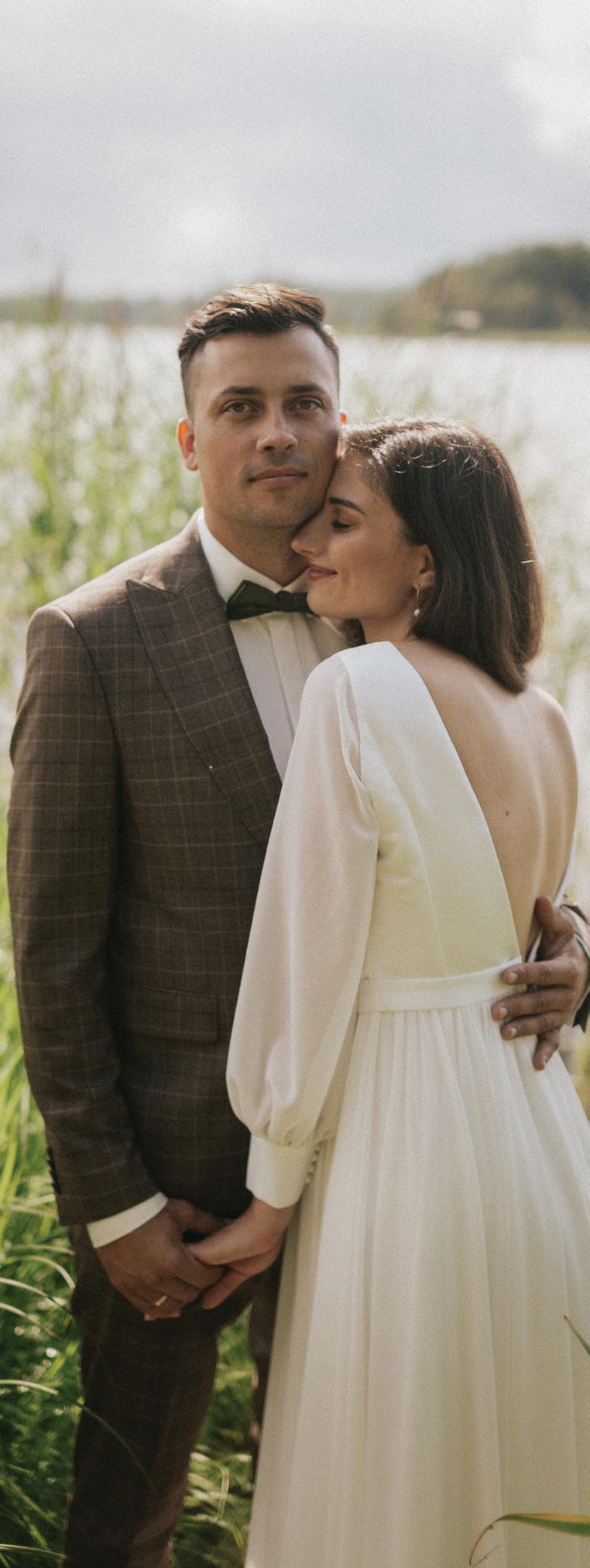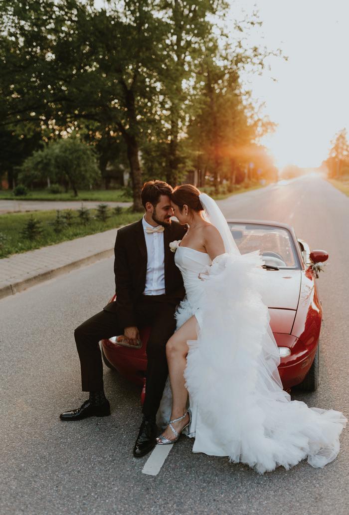 Egija: – Esmu ļoti priecīga par savu kleitas izvēli – jutos ērti, viegli un savā ādā. Biju jau norezervējusi kleitu Rīgā, kad ieraudzīju Instagram tieši tādu kleitu, kādu biju sev iedomājusies. Lidojām uz Varšavu, lai es satiktos ar dizaineri no Ukrainas un uzmērītu noskatīto kleitu (no zīmola Rinovich – red.). Sapratu, ka tā ir īstā! Papildus vēl izdomājām pāršūt trēnu (šlepi), lai tas ir noņemams un vakara daļā varētu ļauties dejām.