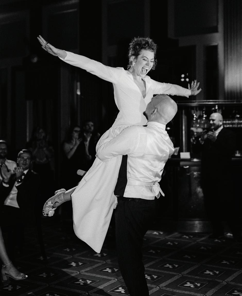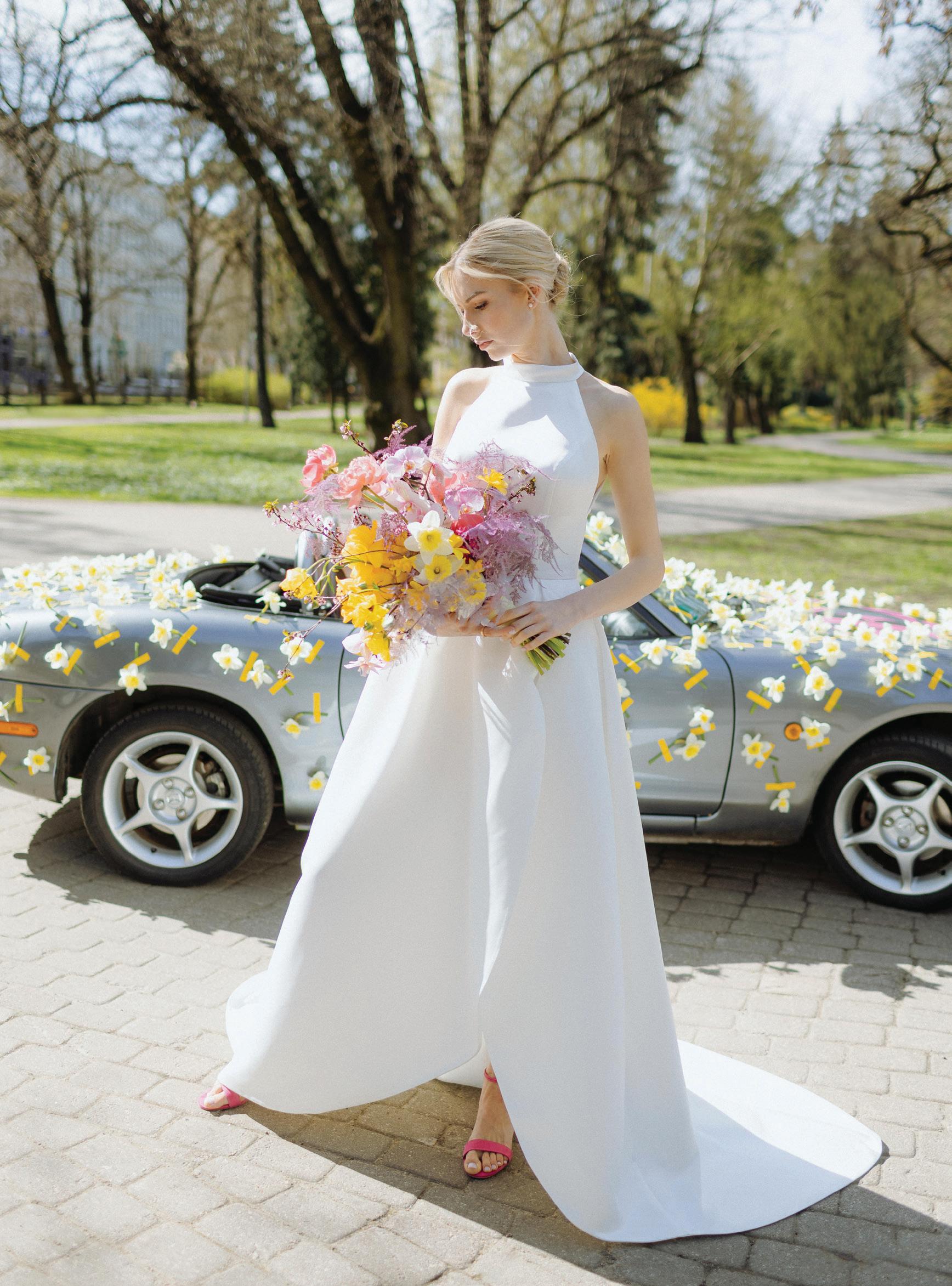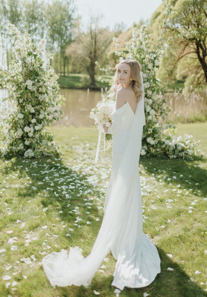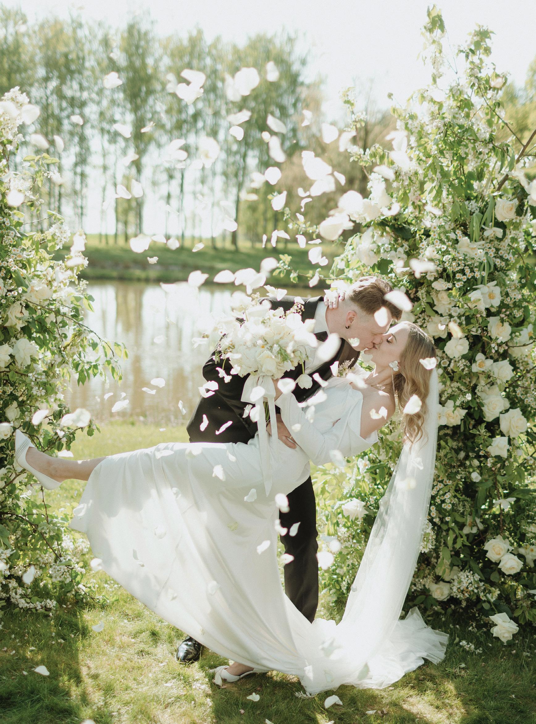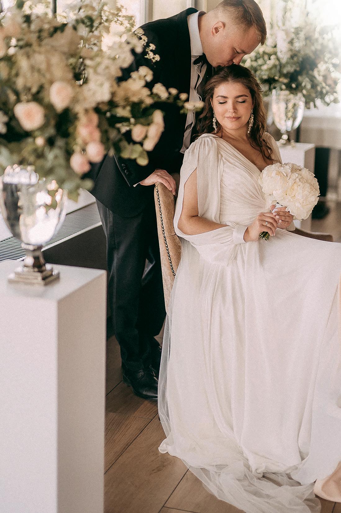 Egija: – Esmu ļoti priecīga par savu kleitas izvēli – jutos ērti, viegli un savā ādā. Biju jau norezervējusi kleitu Rīgā, kad ieraudzīju Instagram tieši tādu kleitu, kādu biju sev iedomājusies. Lidojām uz Varšavu, lai es satiktos ar dizaineri no Ukrainas un uzmērītu noskatīto kleitu (no zīmola Rinovich – red.). Sapratu, ka tā ir īstā! Papildus vēl izdomājām pāršūt trēnu (šlepi), lai tas ir noņemams un vakara daļā varētu ļauties dejām.