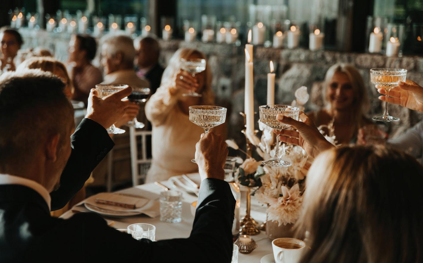 Banketērijas komanda spēj nodrošināt pilnu servisu jūsu kāzu svinībām: ēdienkarte atbilstoši jūsu gaumei un vēlmēm, garda maltīte vairākās ēdienreizēs, sākot ar uzkodām un šampanieti baznīcā, beidzot ar brokastīm nākamās dienas rītā, bārs un dzērieni, profesionāli viesmīļi, kā arī plaša trauku, tekstila un mēbeļu noma.