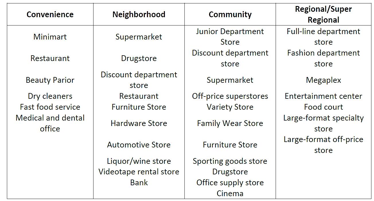 มาที่ศูนยการคาชุมชนประกอบดวย + ซูเปอรมารเก็ต เชน Lotus Express , Foodland , Tops ซึ่งจะชวยใหเกิดฐาน ลูกคาประจําและความถี่ในการเขามาที่ศูนยการคา + รานกาแฟ ปจจุบันในประเทศไทย รานกาแฟที่มีชื่อเสียงกลายเปนผูเชา แมเหล็กที่ศูนยการคาชุมชนตองมี โดย Starbuck ดูจะเปนแมเหล็กลําดับตนๆ ที่ ศูนยการคาอยากใหเขามาชวยดึงดูดลูกคา โดยเฉพาะศูนยการคาที่เนนลูกคา ระดับกลางบนขึ้นไป สวนลูกคาระดับกลาง Café Amezon เปนรานกาแฟที่มีพลัง ดึงดูดลูกคาไดดี รวมถึงรานกาแฟดังๆ อีกหลายราน + รานอาหาร โดยเฉพาะรานอาหารดังๆ เชน McDonald , KFC ,MK , S&P เปน ตน รวมถึงรานอาหารไทยดังๆ ประจําทองถิ่น อยางศูนยการคาชุมชนแถวภาค ตะวันออก การไดรานอาหารทะเลชื่อดังประจําจังหวัดเขามาเปนสาขาในศูนย ยอมชวยดึงดูดลูกคาไดดี + ธนาคาร เปนอีกแรงดึงดูดสําคัญของศูนยการคา + บริการยานยนต เชน ศูนยเปลี่ยนยาง ลางรถและเปลี่ยนถายน้ํามันหลอลื่น ยิ่งถามีสถานี บริการน้ํามันในศูนยการชุมชนเขาดวยแลวจะเปนพลังใหเกิดการหมุนเวียนของลูกคา ซึ่ง ปตท.เองชวงหลังขยายธุรกิจสถานีบริการน้ํามันมาเปนศูนยการคาชุมชนโดยมีปมน้ํามันเปน แรงดงดูดหลัก + รานคาปลีกอื่นๆ เชน รานขายยา รานหนังสือ รานแวนตา รานเสริมสวย เปนตน http://thairealestate.org/content/detail/417/จัดผังคอมมูนิตี้มอลล อยางไรใหประสบความสําเร็จ