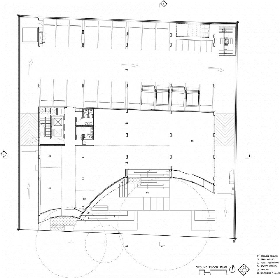พื้นที่นี้เปนเหมือนสอดผสานโปรแกรมของอาคารทั้งหมดเขาดวยกัน ผาน ชองทางเขาที่กรุดวยวัสดุโปรงใสสลับกับกระเบื้องเปนจังหวะลูกเลน และมีชื่อรวมทั้งหมด เรียกวา ‘Common Ground’ ที่พิสูจนมาแลววาใชงานไดลงตัวจากโครงการ The Commons ที่ทองหลอ https://www.baanlaesuan.com/207311/design/designupdate/places/the-commons-saladaeng “ที่สําคัญคือพื้นที่เอาตดอรตรงนี้สามารถปรับเปลี่ยนเปน พื้นที่กิจกรรมและอีเวนตตาง ๆ ที่ทีม The Commons จัด ขึ้นไดอยางอัศจรรย ซึ่งตอนออกแบบที่ทองหลอเราไมรูวาจะมี กิจกรรมอะไรเกิดขึ้นบาง แตตอนนี้เรารูแลว ทําใหเรามีความ ตั้งใจออกแบบสถาปตยกรรมใหปรับเขาหากิจกรรมแทน สิ่งที่ เราทําก็คือออกแบบฐานบันไดพื้นปูน มีชิ้นสวนของแทนไมพา เลต สามารถยกวางเพื่อเปลี่ยนระดับใหสอดคลองกับกิจกรรม ที่จะเกิดขึ้นได”