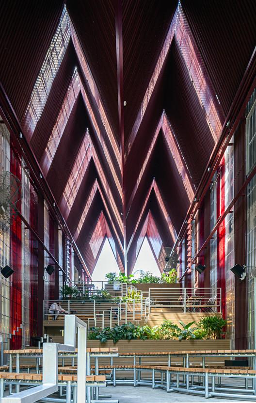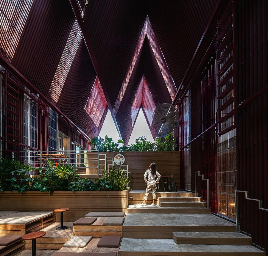 Materials: Floor - Polished concrete and Artificial wood, Wall - Onduline Corrugated Sheet (Red , translucent) and Artificial Wood, Ceiling - Onduline corrugated Sheet, Pallet – Siamese neem Wood, Building Area: 3000 sq.m., Building Footprint Area: 1150 sq.m. Site Area: 1585 sq.m