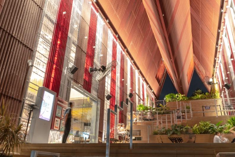 ซึ่งเปนทางลาดและบันไดที่โปรงมาก ลมพัดผานไดจากทุกทิศทาง ผนังของอาคารชั้น 3 – 4 ก็ โปรง ถาลมเขามาจากระยะบน อาคารก็จะดักลมแลวตลบลงมาดานลางได นอกจากนี้ยังมีพัด ลมเพิ่มการหมุนเวียนของอากาศ ทําใหคนขางลางอยูไดสบายดี อาคารชั้น 3 – 4 ออกแบบให เปนเหมือนกลองโปรงๆ ลอยเต็มพื้นที่ ทําหนาที่กันแดดกันฝนไดเกือบรอยเปอรเซ็นต ตลอดเวลา “โจทยถัดมาคือ ปกติคอมมูนิตี้มอลลจะขายดีแคชั้นลาง เราจึงแกปญหาโดยทําบันไดขนาด ใหญเพื่อเชื่อมชั้น ground ขึ้นไปถึงชั้น 2 คนคอยๆ เดินแปบเดียวก็ถึงชั้น 2 อยางไมรูสึกวา พยายาม ชั้น 3 ชั้น 4 โปรงและมีชองทะลุกันจํานวนมาก มองลงมาเห็นชั้นลางไดงาย คนจากชั้น ลางก็มองเห็นรานชั้นบนไดแทบทุกราน ทําใหไมถูกตัดขาด “โจทยขอสุดทายคือ ปกติคอมมูนิตี้มอลลมีผูเชามากมาย แตละรานมักมีปาย การตกแตงหรือ การเจาะผนังแตกตางกัน สถาปตยกรรมเลยคอนขางดูวุนวาย เราจึงหอชั้น 3 – 4 ดวยเหล็กฉีก ที่พับโปรงๆ ทําหนาที่คลุมอิมเมจของสถาปตยกรรมใหดูเรียบรอย สวยงาม ในขณะเดียวกันก็ยัง โปรงพอใหคนมองเห็นวิวไดดวย” “เรารูกันอยูแลววายิ่งเปนนักพัฒนาอสังหาริมทรัพยรายใหมรายเล็กอยางเรา รานคาดานบน อาจจะแย เราไมมีงบที่จะสรางบันไดเลื่อนอะไรเยอะแยะ แตคุณอมตะดีไซนแตละชั้นใหคนอยาก เดินตอไปเรื่อยๆ ได พื้นที่เชื่อมตอกันหมด คนเดินบันไดกันหมดเลย ขนาดมีลิฟตคนก็ยังไมคอยใช นี่เปนครั้งแรกที่เราทําอะไรในสเกลนี้ และไดเห็นวาสถาปตยกรรมและบริบทแวดลอมที่ดีทําให พฤติกรรมของคนเปลี่ยนไดจริงๆ”